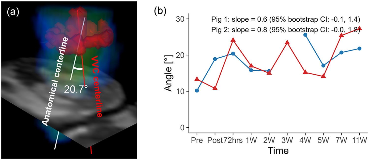 Representative 4D flow MRI visualizations, including MR magnitude images, particle traces, velocity fields, and vortex structures, are shown in Figure 6, where helical flow was observed only in particle traces seeded at the VVC (Supplementary Video S2). The schematic for angle quantification is shown in Figure 7a. Progressive reductions in myocardial wall motion, particularly within regions affected by MI, were observed at pre-MI, 4W, and 11W with flow visualizations (Supplementary Video S3). The VVC angle showed increasing temporal trends in both animals (slope = 0.6, 95% CI: −0.1 to 1.4 in pig 1; slope = 0.8, 95% CI: 0.0 to 1.8 in pig 2) (Figure 7b). However, temporal changes in regional vorticity showed no clear temporal tendencies (Supplementary Figure S4). The E/A flow ratio, average vorticity at the infarct, adjacent, and remote regions, and the angle between the anatomical center and the VVC center are summarized in Table 3.