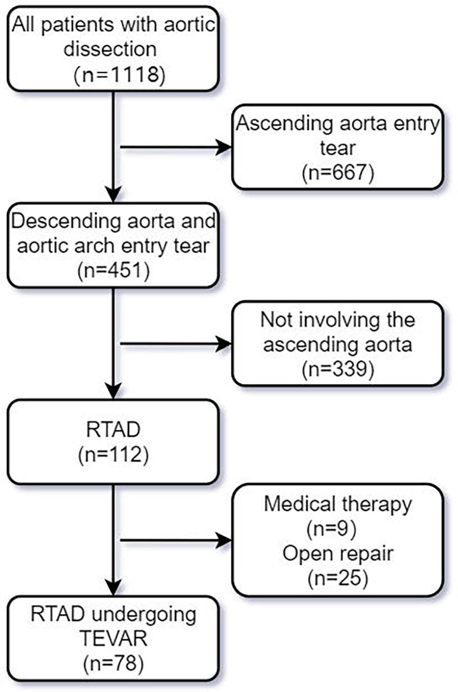 Acute type A aortic dissection is a life-threatening aortic syndrome that involves the ascending aorta and necessitates emergency aortic repair. According to the Society for Vascular Surgery and the Society of Thoracic Surgeons reporting standards, retrograde dissection into the ascending aorta with an entry tear in zone 1 or beyond is classified as a type B aortic dissection, if it extends further retrograde into the ascending aorta, it is a RTAD (1). The incidence of RTAD accounts for approximately 7% to 25% of type A aortic dissection (TAAD) cases (2). Compared to TAAD, the optimal treatment approach for RTAD remains controversial (3, 4). Although aortic replacement is relatively straightforward, it leaves an entry tear that can result in the persistence of the false lumen and complications related to dissection, to sealing entry tear, total arch replacement using the frozen elephant trunk technique is considered the primary option for RTAD patients (5). However, for patients with high surgical risks, such as the elderly or those with significant comorbidities, open repair is associated with increased rates of mortality and complications. Studies indicate that TEVAR has emerged as an alternative to open surgery, effectively sealing the entry tear and promoting aortic remodeling (6). Endovascular therapy may be more beneficial in patients in whom open surgical repair is technically challenging and carries greater surgical risk (2). The American Association for Thoracic Surgery's expert consensus on the surgical management of acute type A aortic dissection suggests that TEVAR may be reasonable for selected patients with RTAD (7). Nevertheless, the efficacy of TEVAR in treating RTAD remains unclear, as only a limited number of patients have undergone this procedure, and reports on long-term outcomes are scarce. The aim of this study is to elucidate the short and long-term outcomes of TEVAR in the treatment of RTAD.