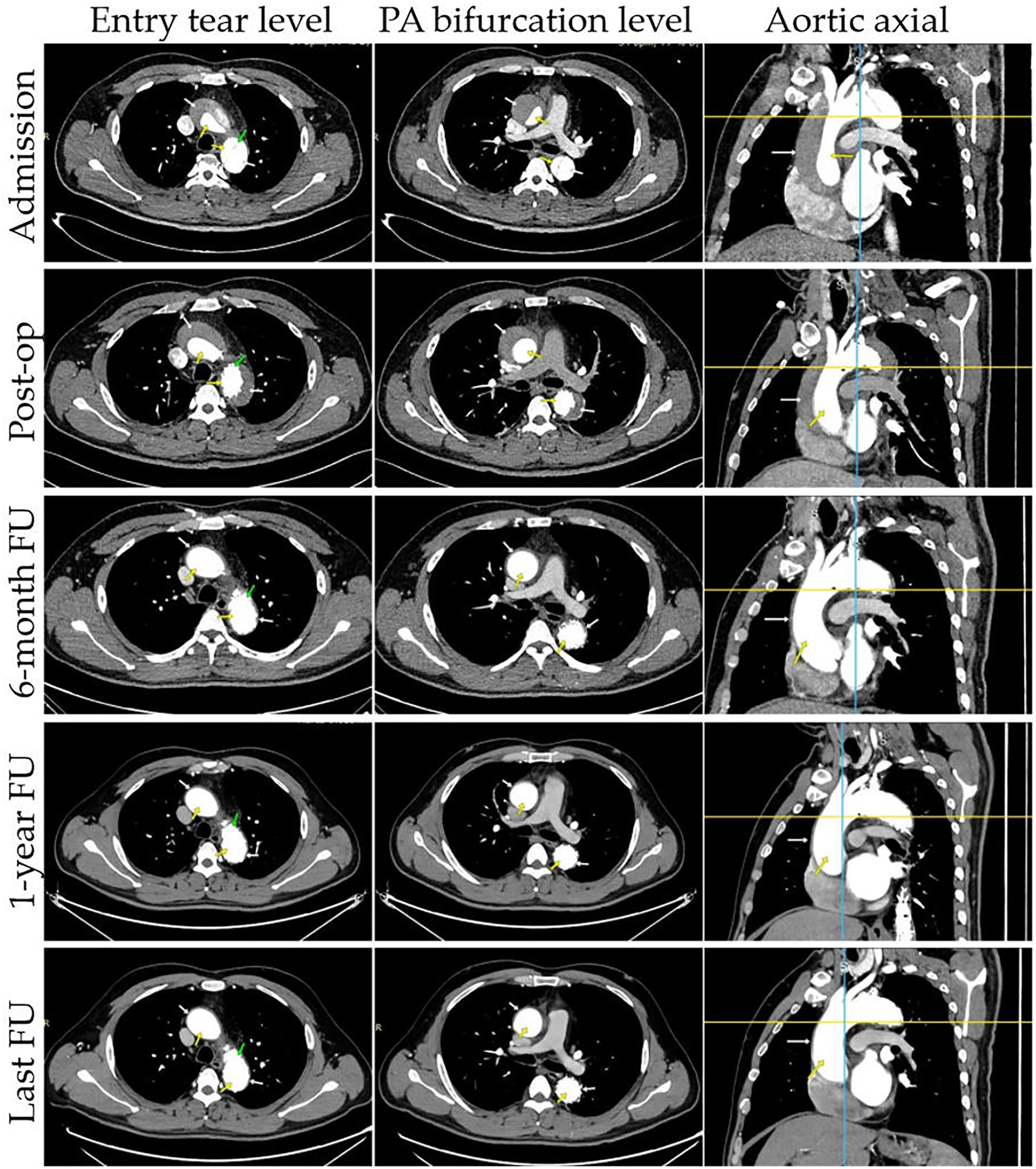 Representative cases of true and false lumens in different aortic segments. Results of CTA images at different time points are presented: entry tear level, PA bifurcation level, aortic axial. CTA images demonstrate the status of the false lumen (patent, partial thrombosis, complete thrombosis, partial absorption, complete absorption; white arrow) and true lumen (yellow arrow) at patient admission, post-operation, and follow-up. The entry tear was completely covered by the stent graft (green arrow).