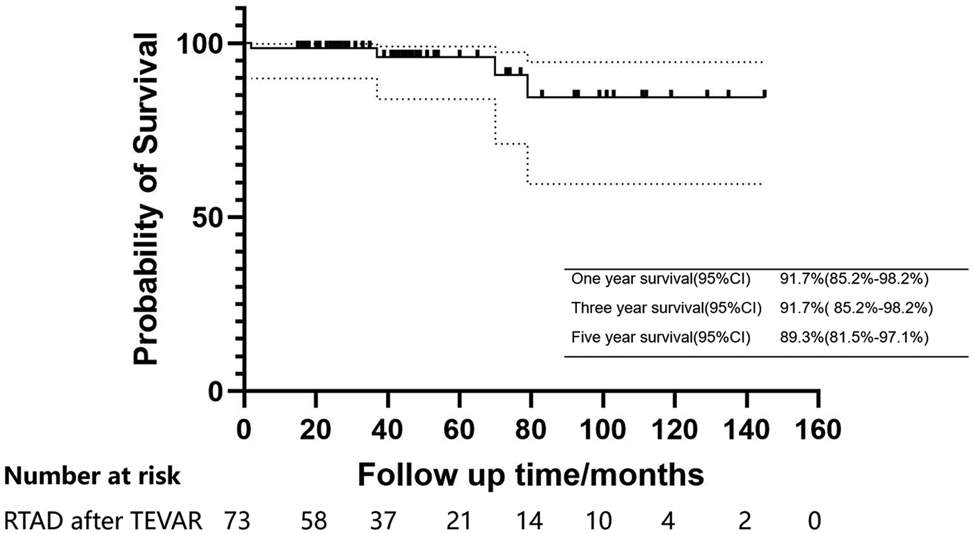 A total of 78 patients were included, all of whom were admitted during the acute or subacute phase. In-hospital mortality and 30-day mortality rates were both 6.4%. The 30-day complication rate was 11.5%. The overall technical success rate was 98.7%. With a median follow-up time of 41 months (interquartile range 25.5–71.5 months), the overall cumulative survival rate were 91.7% (95% CI: 85.2%–98.2%) at 1 and 3 years, and 89.3% (95% CI: 81.5%–97.1%) at 5 years. One of the 78 patients developed an isolated ascending aorta dissection 6 months after surgery; this patient remains alive without treatment. During follow-up, positive ascending aortic remodeling was observed in 89.7% of patients.