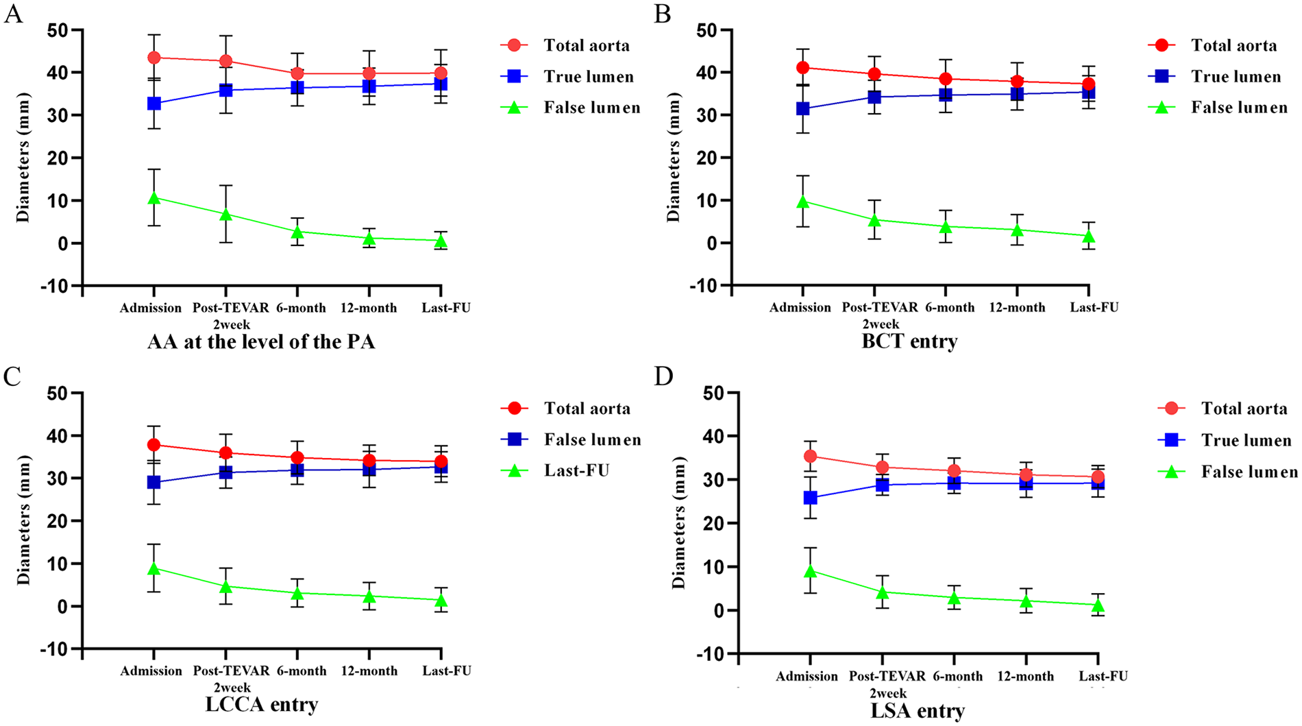 Schoder M Czerny M Cejna M Rand T Stadler A Sodeck GH et al Endovascular repair of acute type B aortic dissection: long-term follow-up of true and false lumen diameter changes. Ann Thorac Surg. (2007) 83(3):1059–66. 10.1016/j.athoracsur.2006.10.064