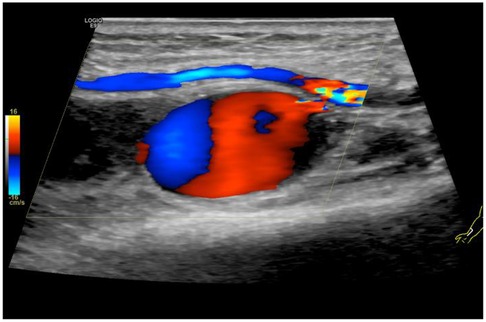 The management of RAP has evolved from primarily surgical repair, once considered a definitive treatment, to a spectrum of strategies including prolonged external compression, ultrasound-guided thrombin injection (UGTI), and endovascular exclusion techniques (6, 7). Small-neck pseudoaneurysms are often amenable to conservative or minimally invasive approaches, whereas those with wider necks or symptoms of compression may require more aggressive intervention (8, 9). UGTI, initially established for femoral pseudoaneurysms, has been increasingly applied in radial artery cases due to its minimally invasive nature and high technical success rates (10). However, its safety profile necessitates careful patient selection and operator expertise to avoid complications such as distal thromboembolism or radial artery occlusion (11). This case report illustrates the successful application of UGTI for a small-neck RAP in a 65-year-old male following coronary PCI, and discusses its role within contemporary treatment algorithms.