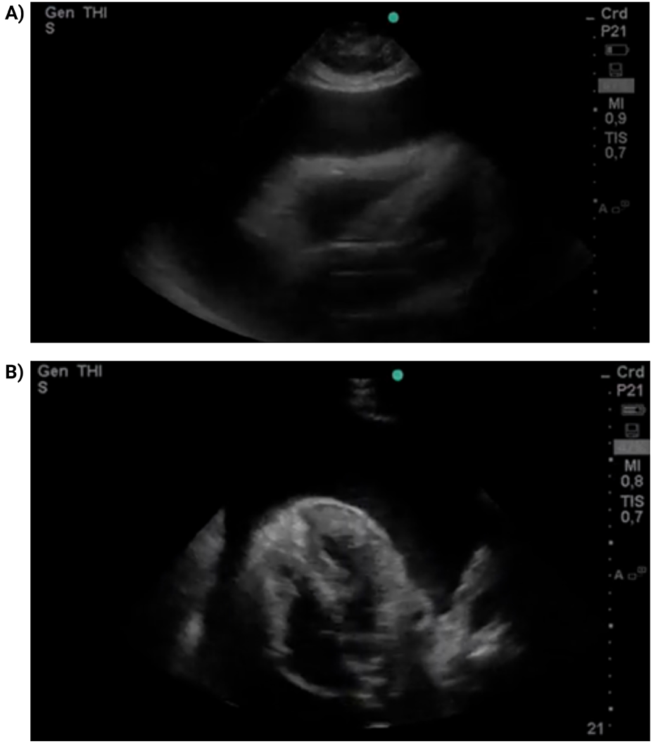 FoCUS parasternal long-axis view (A) and subxiphoid four-chamber view (B) A massive circumferential pericardial effusion is observed (28 mm in diastole), with collapse of right-sided chambers.