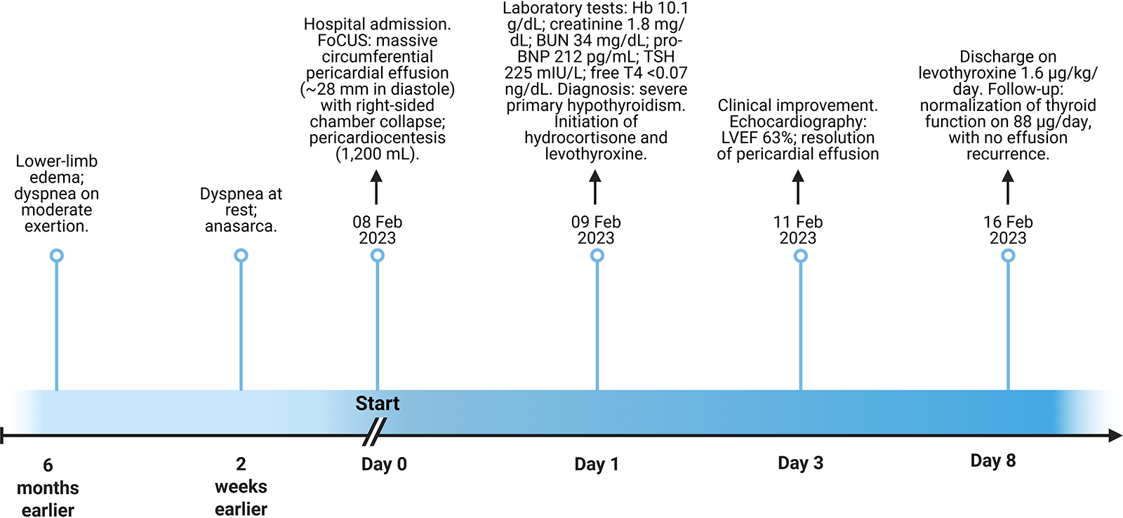 Clinical timeline summarizing presentation, diagnostic findings, and management. FoCUS, focused cardiac ultrasound; LVEF, left ventricular ejection fraction; TSH, thyroid-stimulating hormone; free T4, free thyroxine; BUN, blood urea nitrogen; Hb, hemoglobin.