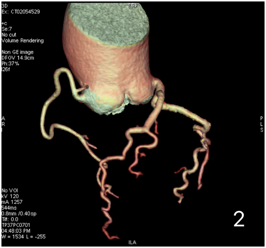 Preoperative coronary computed tomography angiography (CTA) of the patient demonstrates no significant coronary artery stenosis.