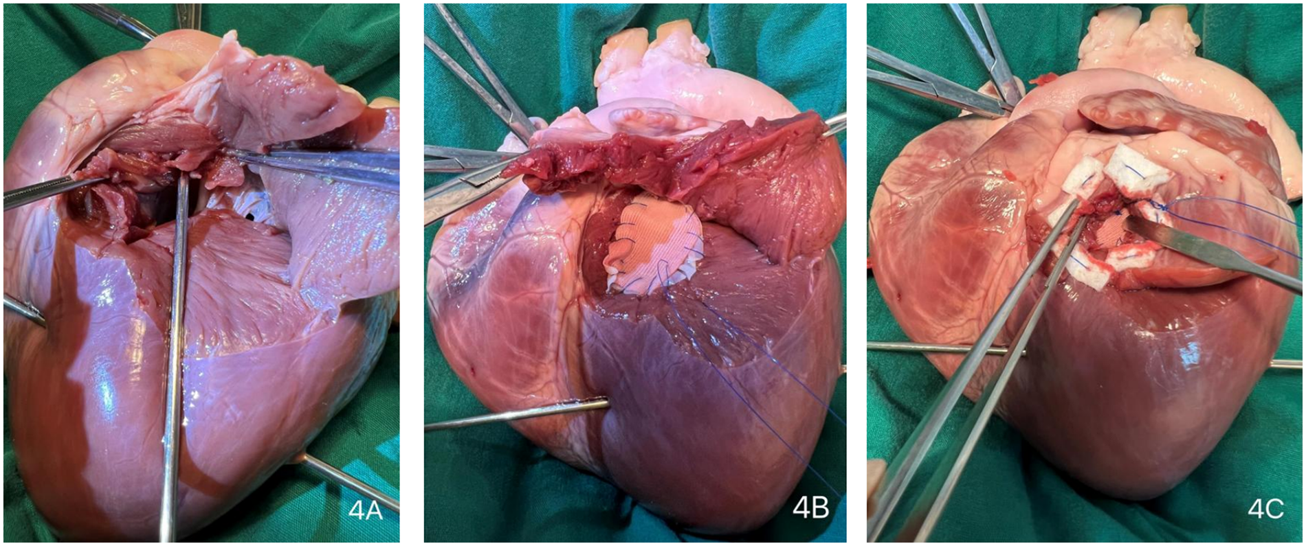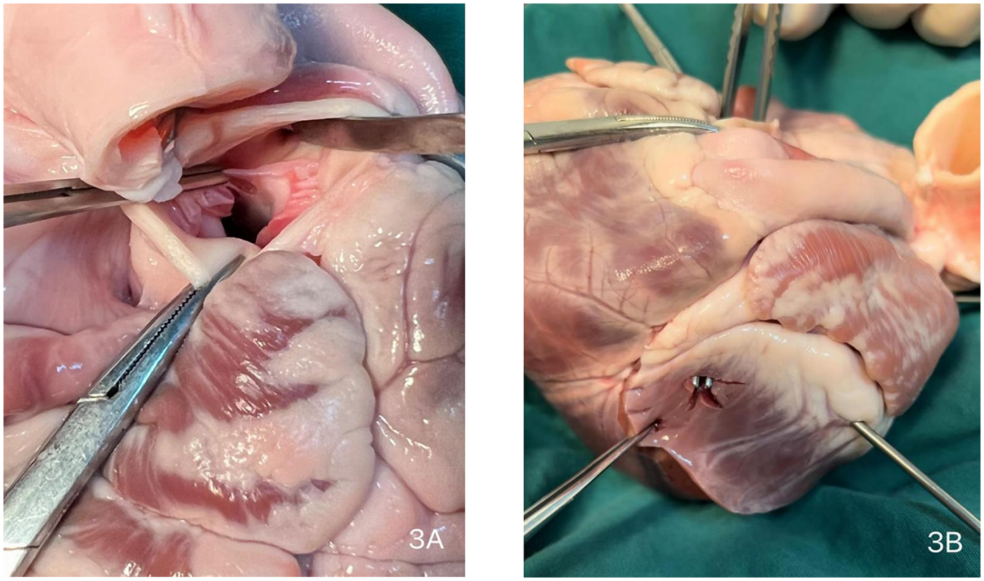 Due to the critical nature of the intraoperative event, no photographic documentation was obtained during the actual emergency repair. The surgical scenario was subsequently simulated and demonstrated using a porcine heart model (Figures 3, 4, and Supplementary Video S1).