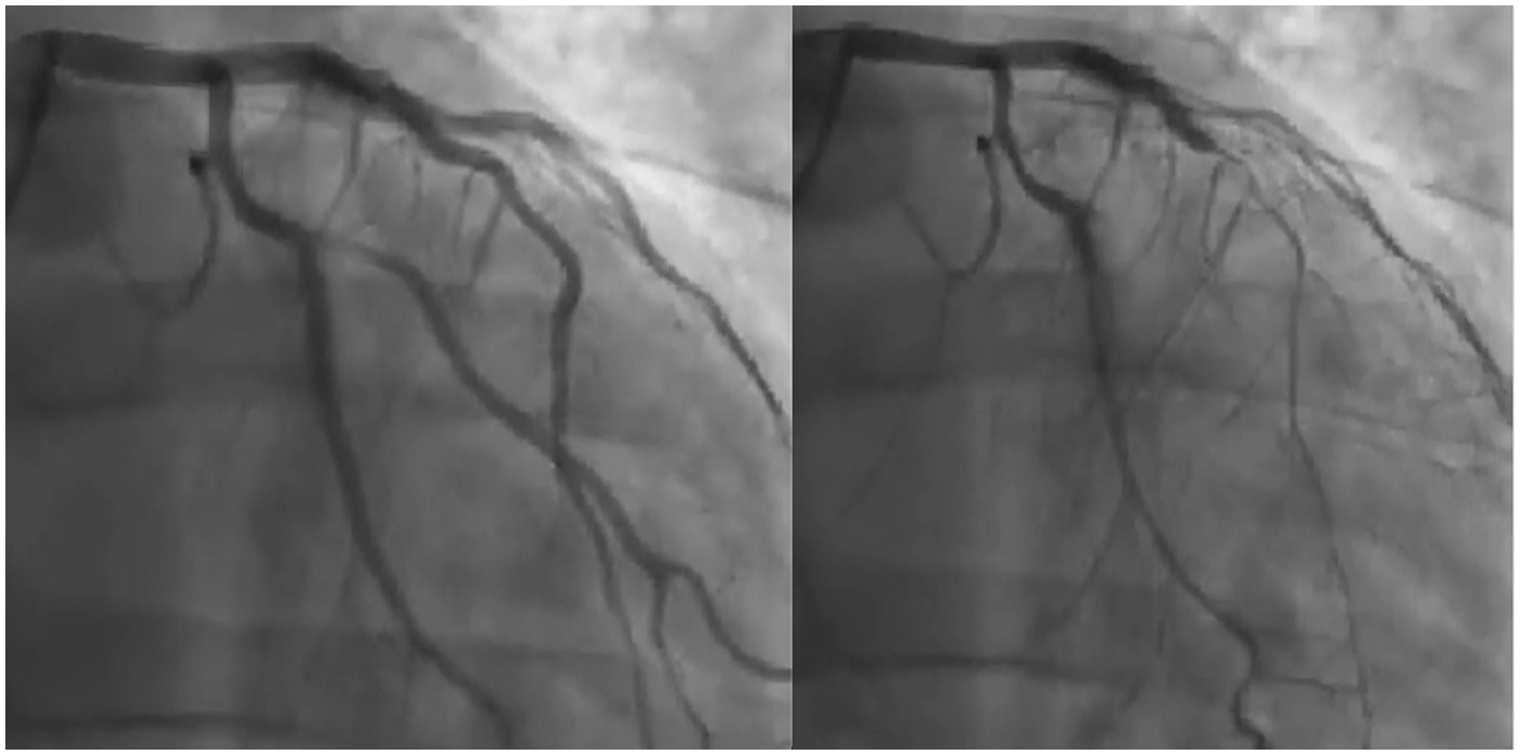 A subsequent coronary angiogram performed in August 2020 did not reveal any new significant stenosis.