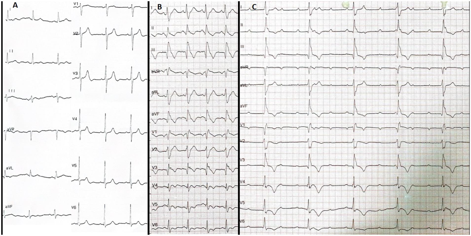 A structured summary of the chronological clinical, electrocardiographic, and echocardiographic findings is provided in Table 1.