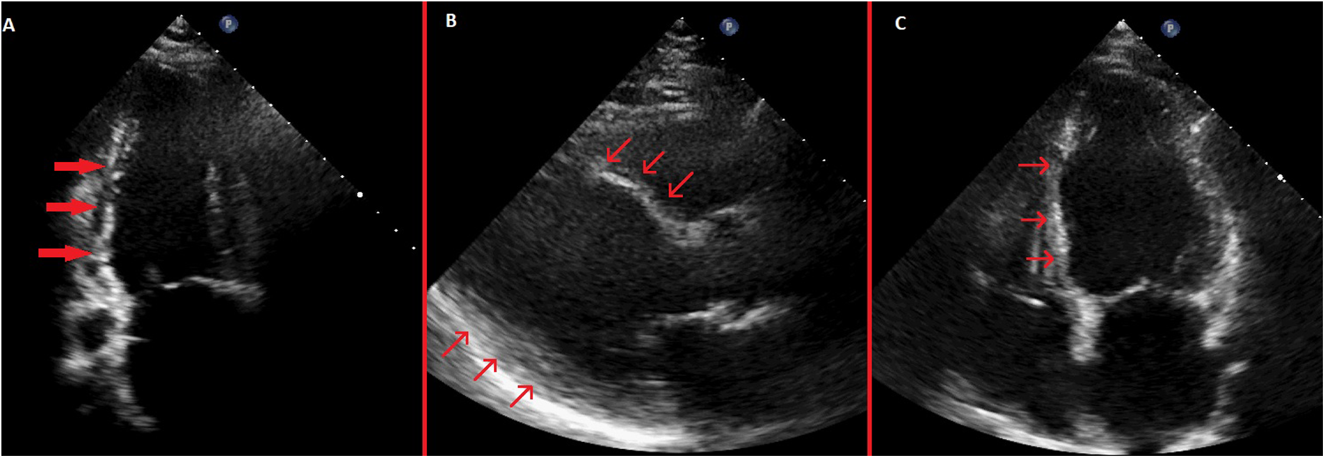 Pre-discharge transthoracic echocardiography images. (A) Systolic apical 2-chamber view showing severe hypokinesis of the inferior wall with thinning of the inferior wall myocardium. (B) Systolic parasternal long-axis view showing akinetic and thinned anterior septum and inferolateral wall hypokinesis. (C) Systolic apical 4-chamber view showing akinetic and thinned basal and mid septum.
