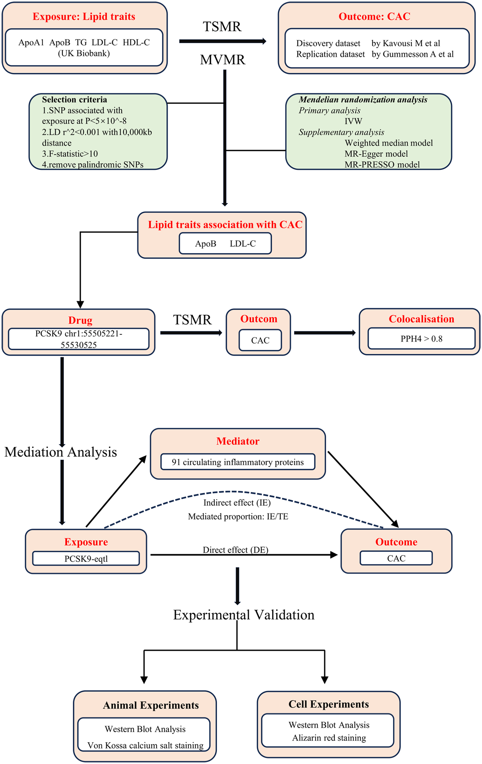 Overview of the study design. ApoA1, apolipoprotein A-I; ApoB, apolipoprotein B; HDL-C, high density lipoprotein cholesterol; LDL-C, low density lipoprotein cholesterol; TG, triglyceride; CAC, coronary artery calcification; TSMR, two-sample Mendelian randomization; MVMR, multivariable Mendelian randomization; SNPs, single nucleotide polymorphisms; LD, linkage disequilibrium; IVW, inverse variance weighted; PCSK9, proprotein convertase subtilisin/kexin type 9; eQTL, expression quantitative trait loci; PPH4, Posterior Probability of Hypothesis 4; IE, indirect effect; DE, direct effect.
