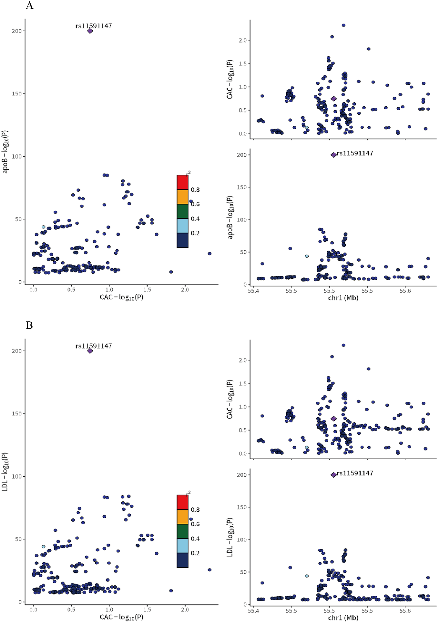 In the Drug Target MR analysis, variants from GWAS datasets of relevant lipid traits were selected as IVs. These variants were located within a 1 Mb window upstream and downstream of the PCSK9 gene (chromosomal location: chr1:55,505,221–55,530,525). The selected IVs were used to assess the association between lipid traits and CAC. Causal effect estimates were obtained using the IVW method, with a p-value < 0.05 considered statistically significant. Additionally, colocalization analysis was performed to determine whether the genetic association signals for the exposure and outcome traits originated from the same causal variant. This step enhances the credibility of causal inference by confirming that observed associations are driven by a shared causal variant rather than distinct variants within overlapping genomic regions.