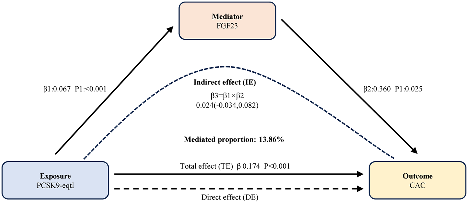 Furthermore, we conducted a two-step Mendelian Randomization mediation analysis to explore potential pathways linking PCSK9 expression to CAC. PCSK9-eQTL data were treated as the “exposure,” inflammatory cytokines as the “mediator,” and CAC as the “outcome.” First, TSMR was performed to estimate the total effect of the exposure on the outcome. Subsequently, stepwise analyses were conducted to evaluate the effect of the exposure on the mediator and the effect of the mediator on the outcome, respectively. A mediating effect was considered present only if IVW analyses in both steps yielded p-values < 0.05. The total effect of PCSK9-eQTL on CAC was decomposed into direct and indirect effects, and the proportion of the total effect mediated by the inflammatory cytokines was calculated as the ratio of the indirect effect to the total effect. The 95% confidence interval for the mediating effect was estimated using the delta method.