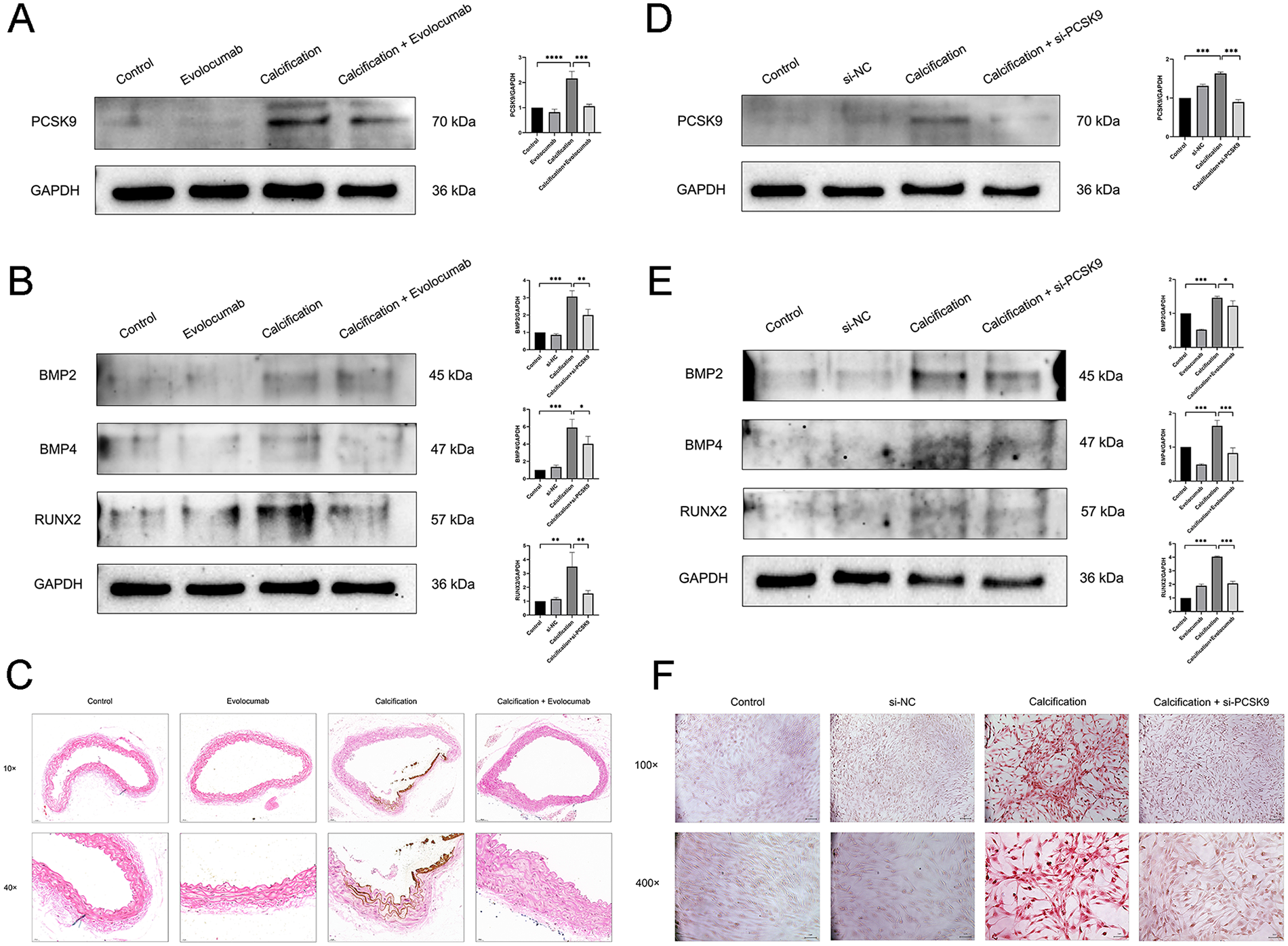 After one week of acclimatization, mice were randomly assigned to four groups (n = 5 per group): (1) Control group, (2) Evolocumab group, (3) Calcification group, and (4) Calcification + Evolocumab group. Mice in the Evolocumab and Calcification + Evolocumab groups received subcutaneous injections of Evolocumab (GLPEIO, USA) at 10 mg/kg every two weeks.