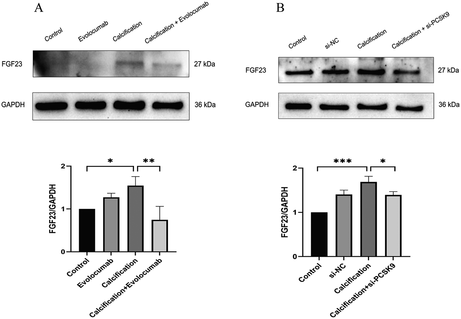 Mouse aorta and HASMC samples were lysed with RIPA buffer containing protease and phosphatase inhibitors. Protein supernatants were collected by thorough agitation and centrifugation at low temperature, and protein concentrations were determined using a BCA assay kit (Beyotime Biotechnology, Shanghai, China). Equal amounts of protein were separated by SDS–polyacrylamide gel electrophoresis and transferred onto polyvinylidene fluoride (PVDF) membranes. Membranes were blocked with 5% skim milk for 2 h at room temperature and incubated overnight at 4°C with the corresponding primary antibodies: PCSK9 (Immunoway, YT7913, 1:1000), BMP2 (Immunoway, YT0498, 1:1000), BMP4 (Immunoway, YT7841, 1:1000), RUNX2 (Immunoway, YM8347, 1:1000), FGF23 (Immunoway, YN6045, 1:1000). Membranes were then incubated for 2 h at room temperature with goat anti-rabbit IgG (H + L)-FITC (Abways, AB0101, 1:5000). Protein signals were detected using an enhanced chemiluminescence system (ECL; Biosharp, Hefei, China) and imaged with an exposure device (Analytikjena, Shanghai, China). Band intensities were quantified using ImageJ software, and protein expression levels were normalized to GAPDH (Abways, AB0037, 1:15,000).