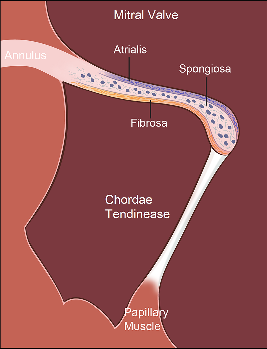 Histological organization of the mitral valve (MV) apparatus. The MV apparatus consists of the annulus, valve leaflets, chordae tendineae (CTs), and papillary muscles (PMs), functioning together as an integrated mechanical unit. Mature MV leaflets display a characteristic trilaminar architecture: (1) the fibrosa, a dense, circumferentially aligned layer rich in type I and III collagen that provides tensile strength and structural rigidity required for systolic coaptation; (2) the spongiosa, a compliant, proteoglycan- and glycosaminoglycan (GAG)–rich layer containing loosely organized collagen that absorbs shear forces and buffers mechanical transitions between the fibrosa and atrialis; and (3) the atrialis, an elastin-enriched layer with radially oriented elastic fibers that allows leaflet extensibility during ventricular pressurization and rapid recoil during diastole, supporting energy-efficient leaflet motion. These 3 layers enable the MV to withstand continuous cyclic loading while maintaining durability and flexibility across the cardiac cycle.