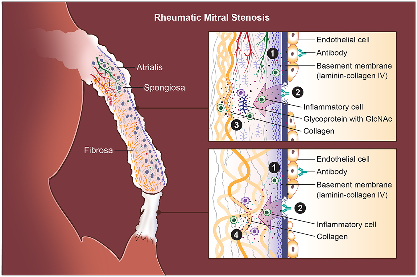 Pathogenic cascade in rheumatic mitral stenosis (RMS). Rheumatic mitral stenosis (RMS) is driven by an autoimmune response initiated by antigenic mimicry between Group A streptococcal (GAS) antigens and structural components of the mitral valve (MV). (1) Endothelial injury is the initiating event: cross-reactive antibodies bind to valve endothelial cells, disrupting intercellular junctions and causing endothelial loosening, damage, and increased permeability. Activated endothelial cells become adhesive and pro-inflammatory, permitting infiltration of T lymphocytes and other immune cells into the leaflet. (2) Exposure and immune targeting of the basement membrane occur as endothelial disruption uncovers laminin- and collagen IV–rich layers; antibodies directed against these components further amplify tissue injury. (3) Stromal autoimmunity and extracellular matrix (ECM) degradation follow as inflammatory cytokines and antibodies against GlcNAc-containing glycoproteins and collagen I penetrate the spongiosa, promoting matrix breakdown and remodeling. Immune complex deposition concurrently induces aberrant neovascularization and lymphangiogenesis within the leaflet, sustaining chronic inflammation. Chordae tendineae (CT) undergo a parallel pattern of immune-mediated injury. Unlike leaflets, where glycoproteins are abundant, the CT core is densely collagenous; thus, (4) autoantibodies predominantly target collagen I within the chordae, leading to accentuated collagen injury, fibrosis, and progressive chordal shortening. Finally, these immune-driven injuries produce leaflet thickening, stromal fibrosis, commissural fusion, and CT shortening, eventually resulting in fixed obstruction of the mitral orifice and the hemodynamic consequences characteristic of RMS.