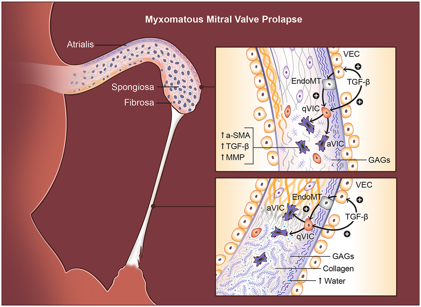 Histopathological and cellular changes in myxomatous mitral valve prolapse (MMVP). Myxomatous degeneration is characterized by multilayered structural disruption. In the atrialis, elastic fibers become fragmented, while in the fibrosa, collagen bundles are disorganized and infiltrated by myxoid matrix. The spongiosa is markedly expanded and filled with loose, proteoglycan-rich extracellular matrix, accompanied by reduced collagen and fragmented elastin. TGFβ signaling drives endothelial-to-mesenchymal transition (EndoMT) in valve endothelial cells (VECs) and activates valve interstitial cells (VICs), increasing BMP and MMP expression, promoting proteoglycan accumulation, and inducing collagen disorganization that leads to leaflet thickening. Chordae tendineae (CT) undergo parallel pathological changes, including diffuse proteoglycan deposition, expansion between collagen bundles, and fragmentation of elastic and collagen fibers. These alterations weaken tensile strength, resulting in chordal elongation or rupture. Compared with normal chordae, myxomatous chordae contain longer glycosaminoglycans, higher water content, and a greater proportional increase in proteoglycans than observed in leaflets.