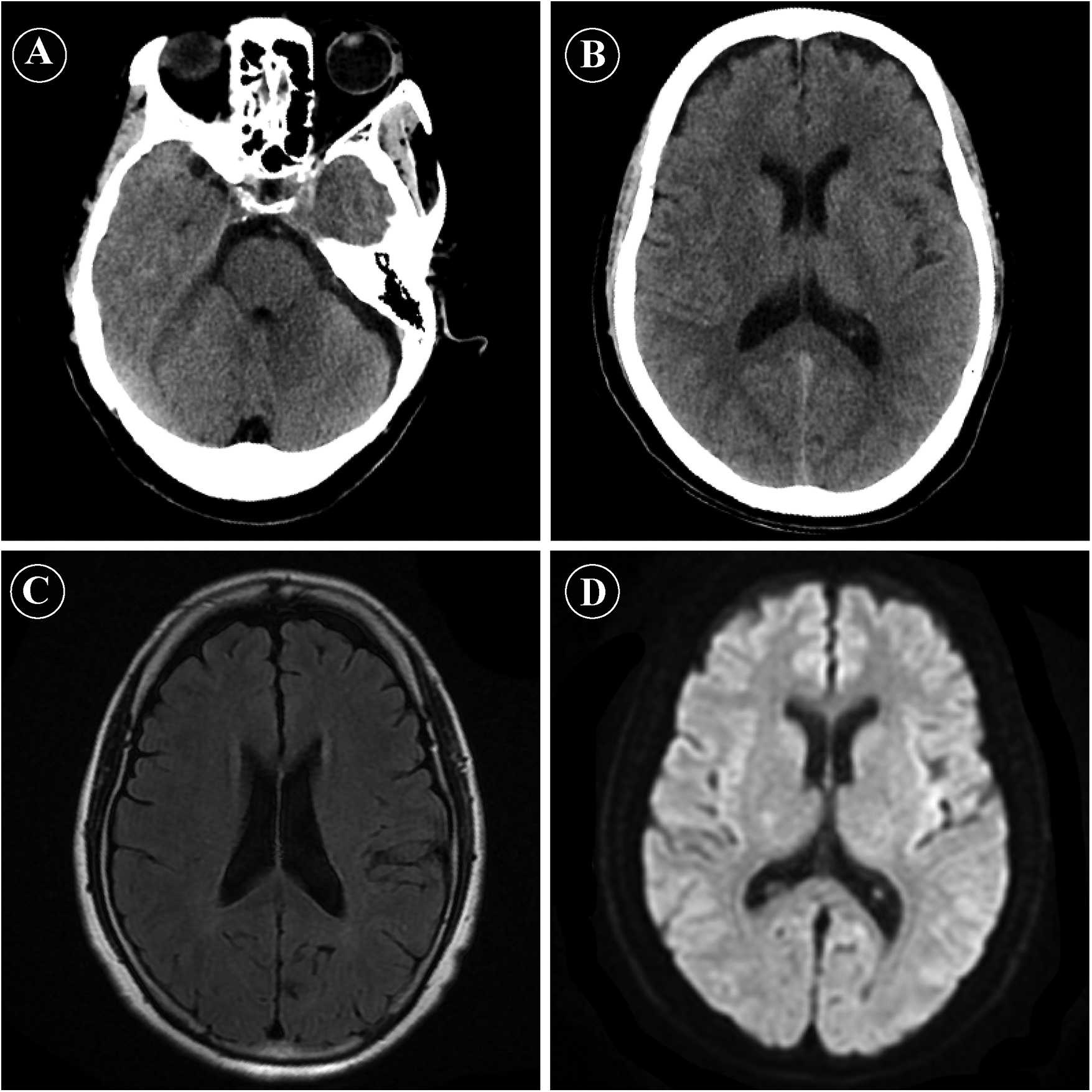 Emergency neuroimaging findings after coronary angiography. (A,B) Non-contrast cranial computed tomography (CT) images obtained shortly after symptom onset, showing no evidence of intracranial hemorrhage or acute ischemic lesions. (C) Axial fluid-attenuated inversion recovery (FLAIR) magnetic resonance imaging (MRI) showing no abnormal signal intensity in the bilateral occipital lobes or other brain regions. (D) Diffusion-weighted imaging (DWI) revealing no diffusion restriction, effectively excluding acute cerebral infarction.