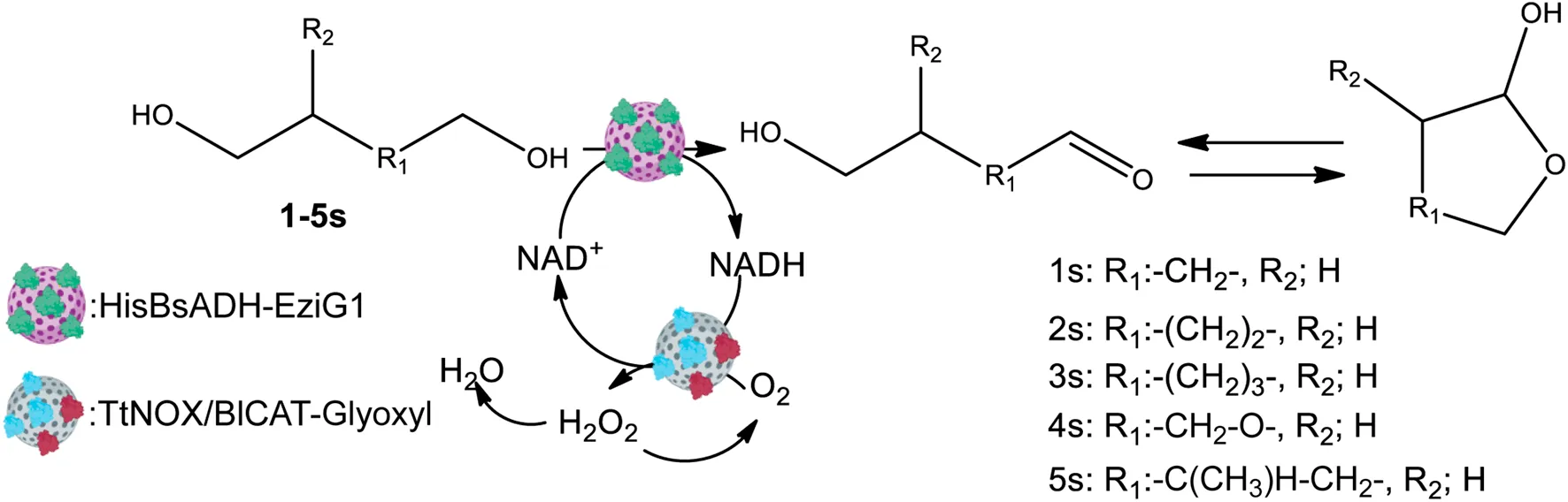 TABLE 2. Biocatalytic oxidation of diols catalyzed by immobilized His-BsADH on EziG1 coupled with an immobilized enzymatic cofactor regeneration system (TtNOX and BlCAT co-immobilized on AG-G).