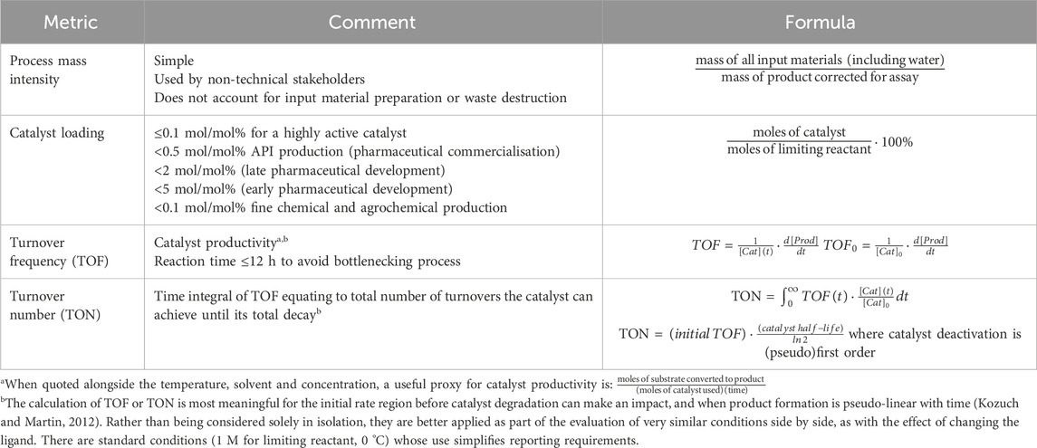 Key to a palladium-catalyzed cross-coupling used in active ingredient manufacture becoming sustainable and commercially viable is a high turnover catalyst that operates via a single catalytic cycle. This naturally allows access to a low loading of catalyst, and controls the footprint associated with the ligand, which will inevitably be the product of a multistep synthesis and, unlike the palladium, cannot be recovered after use. We also emphasize that it is better to develop outright a catalyst with a high turnover, than to try and recycle one with moderate activity (Gladysz, 2001). There is also merit, in the first instance, in decoupling the identification of the on-cycle catalyst, from the selection of conditions that lead to its practical formation from a shelf-stable precursor in the reaction environment. Achieving a low catalyst loading, without the need for a “kicker charge” of catalyst, requires intimate knowledge of the interconversion of the different palladium species present, including activation of a precursor material and catalyst deactivation. Regarding the last point, access to high turnover palladium catalysts requires more research into what and how they deactivate. Metrics that support the development of a high turnover system, alongside catalyst loading, are process mass intensity, catalyst turnover number and frequency. The most informative means of characterizing a palladium-catalyzed cross-coupling is not tabulated in Table 1. This is of course a form of the rate law, as shown in Figure 1, and knowledge of the observed rate constant and its dependence on temperature. On this note, we reflect that as process chemists, catalysis and automation specialists and data scientists collaborate on the development of the active ingredients of the future, their workflows are best informed by mechanism-driven hypotheses (Farina, 2023).