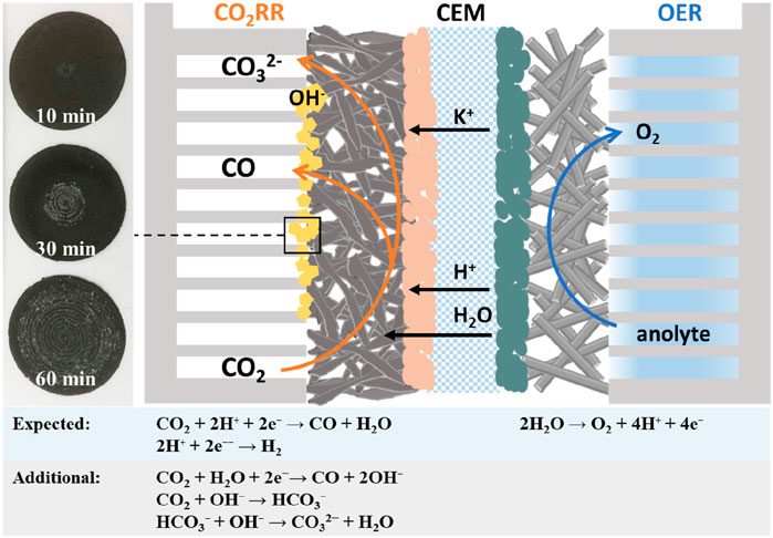 High CO selectivity is maintained over a wide range of operating conditions; however, an unexpected pressure surge occurs after 60 min at ambient temperature and pressure due to white precipitate formation on the GDE backside (Figure 6), a phenomenon also observed in other MEA systems (Hernandez-Aldave and Andreoli, 2020; Disch et al., 2023; Park et al., 2023). This indicates that, despite employing a proton exchange membrane in a catholyte-free configuration, the cathode microenvironment alkalinizes as the reaction proceeds. High current densities enhance water uptake at the cathode GDE–CEM interface (Shafaque et al., 2020), promoting reactions between CO2 and water (CO2 + H2O+ 2e−→ CO + 2OH−, 2H2O+ 2e−→ H2 + 2OH−) transported from the membrane (Wheeler et al., 2020; Choi et al., 2022b). Strong CO2RR activity accelerates hydroxide generation, elevating local alkalinity and driving reactions with K+ migrating from the anode, leading to potassium (bi)carbonate (CO2 + OH− → HCO3−; HCO3− + OH− → CO32− + H2O) precipitation at the cathode (Garg et al., 2023; Bai et al., 2024). In a parallel study with the same zero-gap configuration and conditions but employing an anion exchange membrane, stable operation for over 100 h at 50 °C was achieved (Zhong et al., 2025a), underscoring the critical role of the cathode microenvironment in determining long-term stability. Although CEM primarily conducts protons, CO2RR-driven hydroxide buildup still renders the local environment alkaline, posing a fundamental constraint on extended operation. Despite this limitation, the early-stage performance provides a robust basis for elucidating the interplay between key operational parameters and catalytic behavior, which is the central focus of this study.