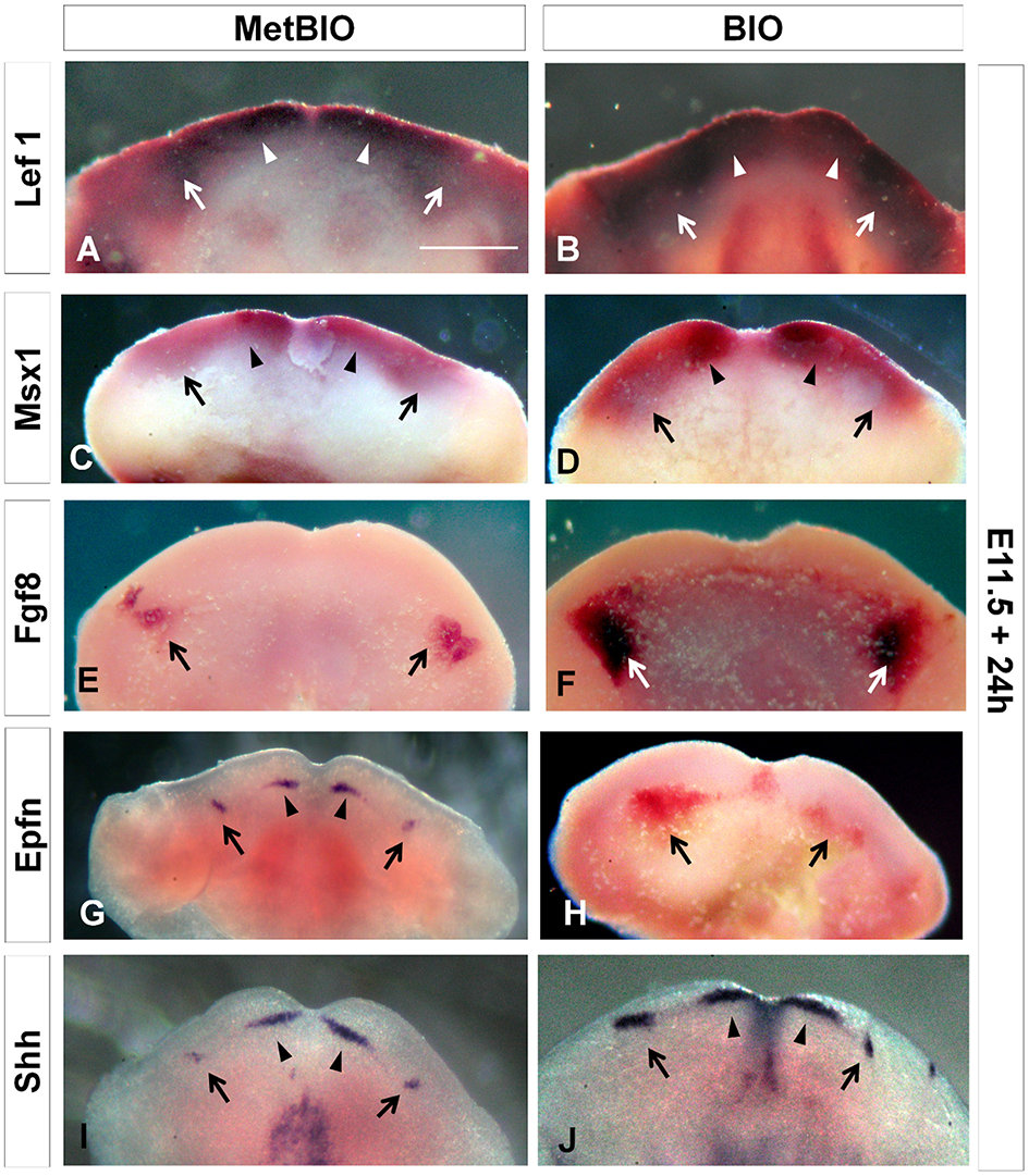 E11.5 first branchial arches cultured with MetBIO (control) or BIO (40 μM) for 24 h. In situ hybridization for Lef1(A,B), Msx1(C,D), Fgf8(E,F), Epfn(G,H), and Shh(I,J) mRNA. The expression of these genes increased and extended to the distal region of branchial arches in BIO treatment samples, when compared to controls. Arrows and arrowheads indicate the presumptive molar and incisor region, respectively. Scale bar: 200 μm.