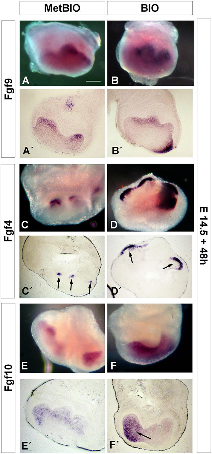 We studied the expression of Fgf genes in molar samples after hyperactivation of Wnt/β-catenin. In our experiments, the expression of Fgf9 increased slightly in molars treated for 48 h with BIO (Figures 4A–B′); however, the expression of Fgf4 and Fgf10 increased markedly (Figures 4C–F′). The most striking change in expression was observed for Fgf4, which was normally restricted to the enamel knots in control samples and whose presence appeared greatly enhanced and extended along the inner dental epithelium in samples treated with BIO (Figures 4D,D′). Fgf10 expression was also upregulated, but this increase was restricted to the mesenchymal region (Figures 4E–F′).