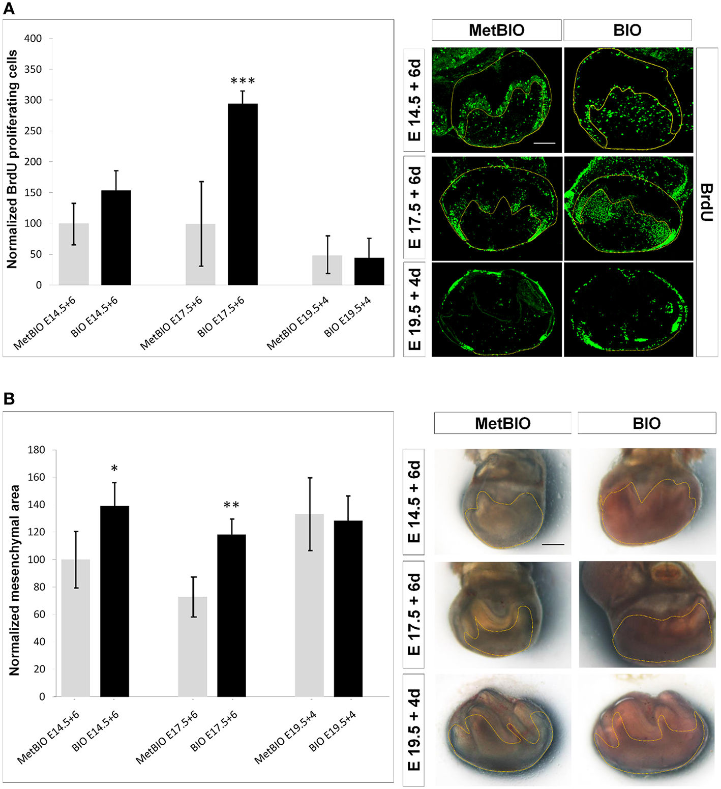 Since we had observed that Fgf expression increased after treatment with BIO both in branchial arches and in tooth morphogenesis stages, and given the wide-known growth promoting effect of FGFs, we analyzed the rate of in vitro cell proliferation in first molars undergoing Wnt/β-catenin overactivation by BIO. Thus, first molars were isolated at E14.5, E17.5, and E19.5 (morphogenesis, pre-odontoblast and ameloblast cell differentiation stages, respectively) and treated with BIO for 6 or 4 days (only for E19.5 molars). First, quantification of BrdU immunohistochemical labeling revealed a significant increase in cell proliferation in the dental mesenchyme of BIO-treated E17.5 teeth compared with the control. BIO-treated E14.5 molars increased cell proliferation but not significantly, and 19.5 molars showed cell proliferation similar to that observed under control conditions (Figure 5A).