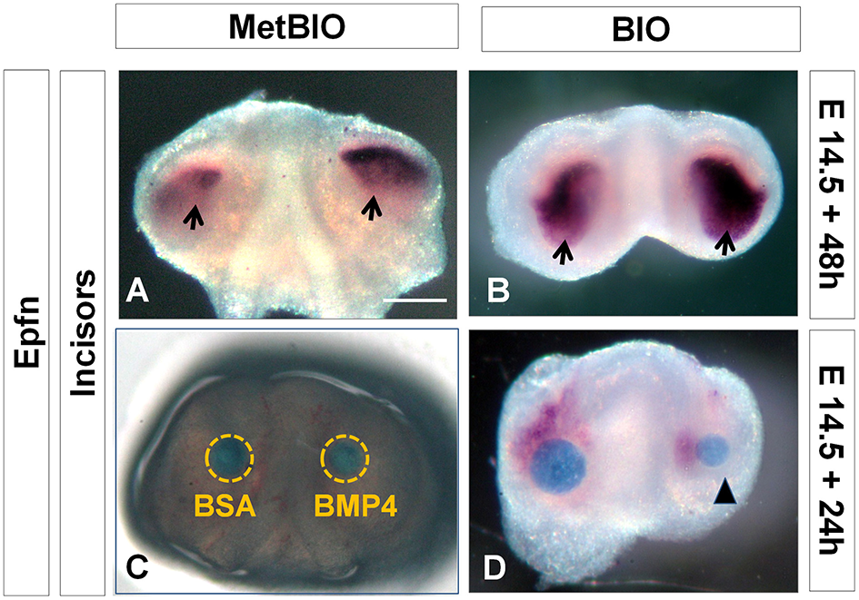 Epfn in situ hybridization of E14.5 incisors cultured with microbeads containing Met-BIO, BIO (20 μM), or BMP4. Wnt/β-catenin overactivation induced an increase in Epfn expression in the dental mesenchyme (B) compared to the control (A). In situ hybridization for Epfn on E14.5 incisors cultured for 24 h in the presence of BSA (control) or Bmp4 beads (C,D). Bmp4 downregulated (arrowhead) Epfn expression in incisors during the morphogenesis stage. Scale bar: 200 μm.