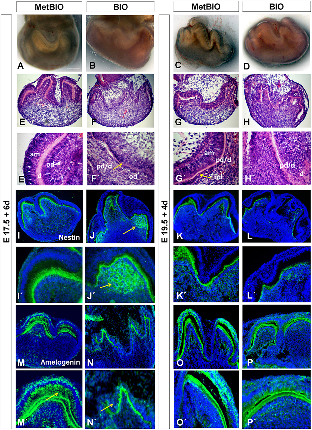 MetBIO (control) and BIO (20 μM) treatment of E17.5 and E19.5 first molars for 6 or 4 days. Whole molar cultures analyzed by stereoscopic microscopy (A–D). Frontal sections of molars stained with hematoxylin-eosin (E–H′). These pictures show striking differences in the growth of the inner dental epithelium and in odontoblast differentiation of control (E,E′, G,G′) and BIO-treated (F,F′, H,H′) samples. Immunofluorescence for Nestin (I–L′) and Amelogenin (M–P′) in control and BIO-treated molars. Nestin labeled odontoblasts and spread to the subodontoblastic area (arrow, J,J′) in E17.5 BIO-cultures, whereas in the controls (I,I′), NNestin was restricted to the odontoblastic layer. In E19.5 cultures, both controls and treatments showed Nestin in odontoblasts (K,L′). The presence of amelogenin significantly decreased (N,N′) in E17.5 BIO-treated inner dental epithelium (N′, arrow) compared to controls (M,M′, arrow). E19.5 cultures treated with BIO (P,P′) exhibited slightly reduced amelogenin expression compared to the controls (O,O′). am, ameloblasts; od, odontoblasts; pd/d, predentin/dentin. Scale bar: 200 μm.