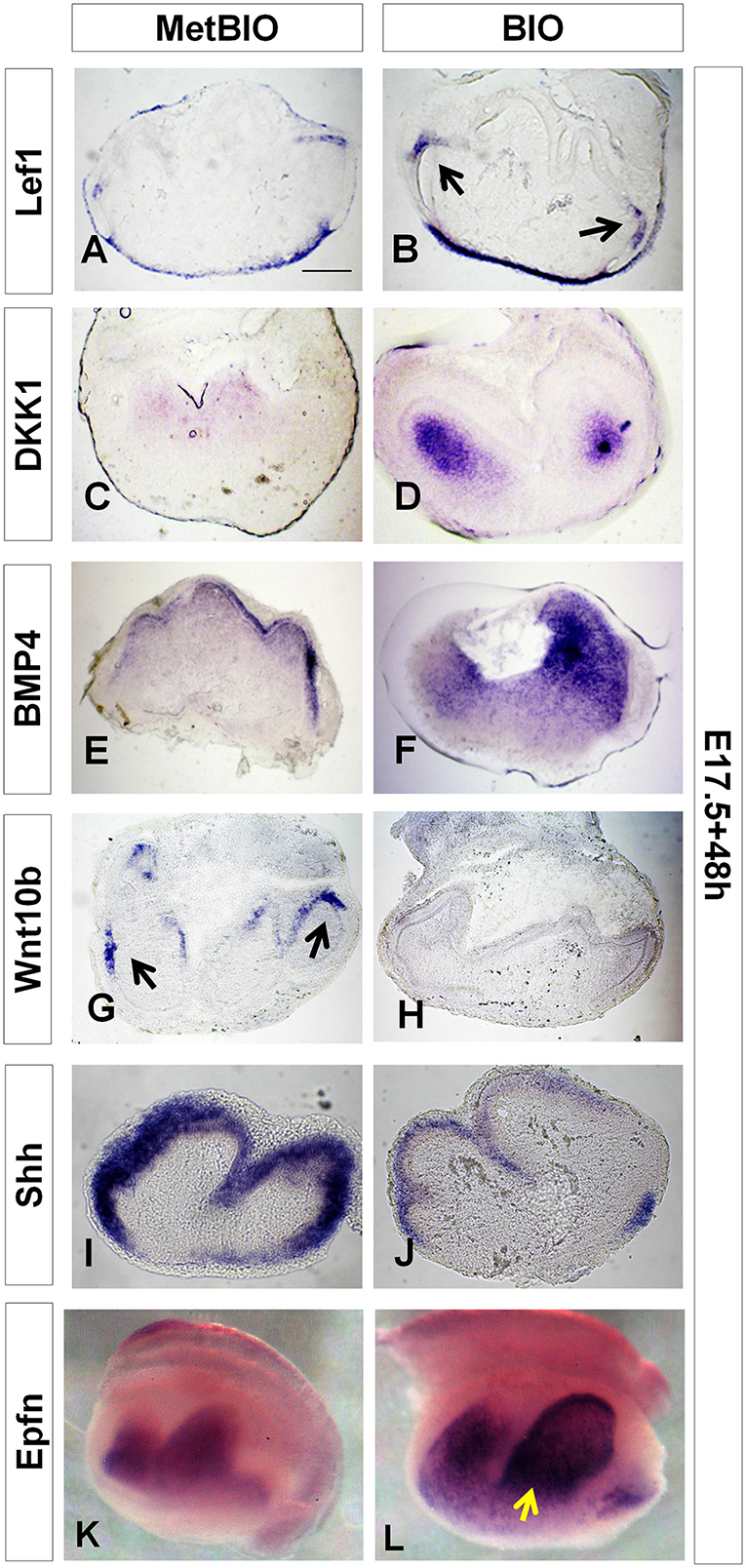 E17.5 first molars cultured with MetBIO or BIO (20 μM) for 48 h. In situ hybridization for Lef1(A,B), Dkk1(C,D), Bmp4(E,F), Wnt10b(G,H), Shh(I,J) and Epfn(K,L). Sections of cultured molars showing that Wnt/β-catenin overactivation increased gene expression in dental epithelium (Lef1 and Epfn, B,L) and/or dental mesenchyme (Dkk1, Bmp4, and Epfn); however, Wnt10b and Shh(H,J) expression was reduced with BIO treatment. Scale bars: 200 μm.