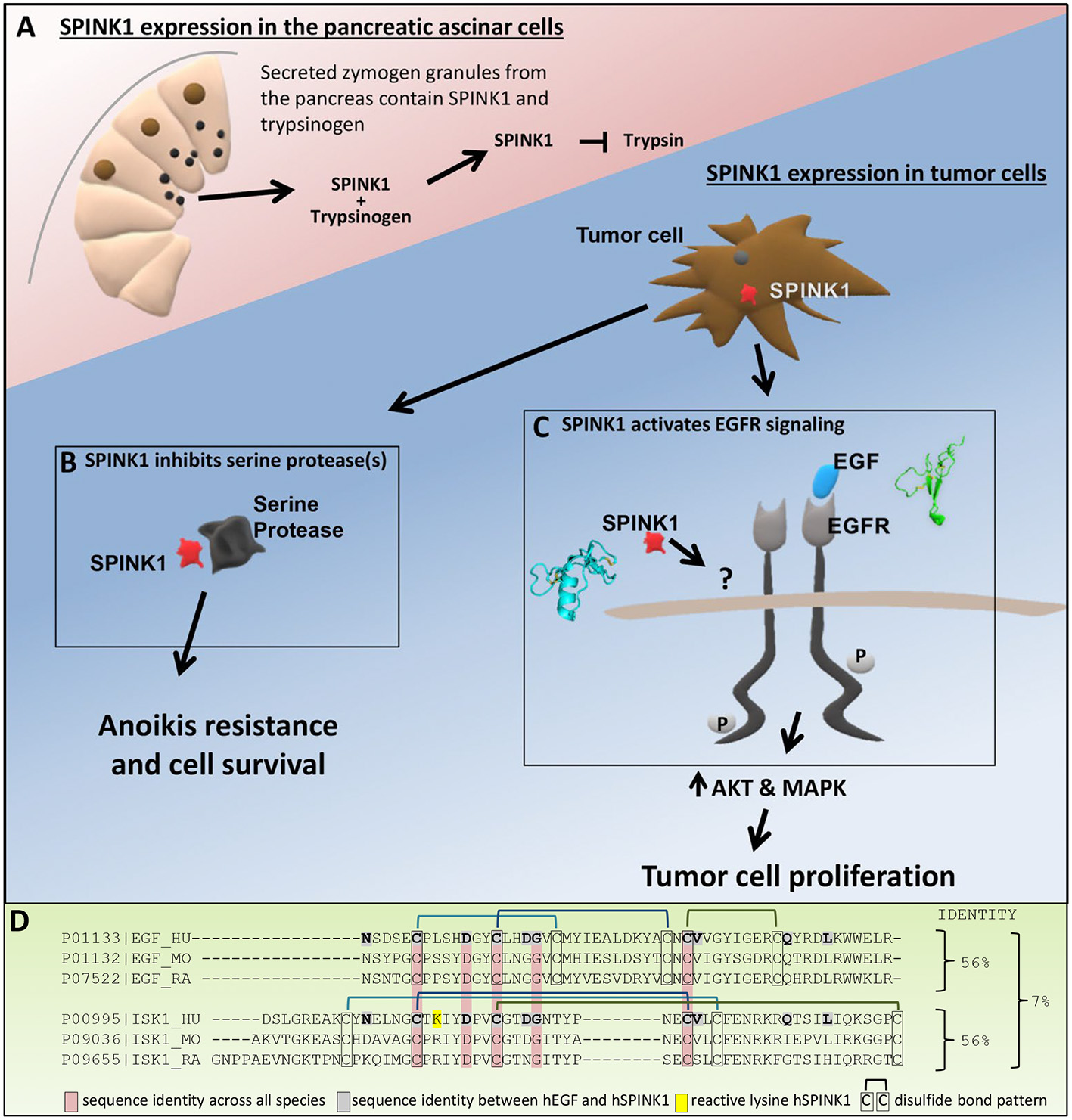 Roles of SPINK1. (A) In the pancreas, SPINK1 acts as an important regulator of protease activity. SPINK1 is co-expressed with trypsinogen by the pancreatic acinar cells and secreted from zymogen granules into the pancreatic duct. Within the acinar cells or the duct, SPINK1 quenches prematurely activated trypsin to prevent further protease activation and organ damage. (B) Tumor cell secreted SPINK1 inhibits unknown serine protease(s) to induce anoikis resistance, tumor cell survival and metastatic disease. (C) Tumor cell secreted SPINK1 activates EGFR kinase pathways and leads to tumor cell proliferation; the direct receptor of SPINK1 in this context requires further definition. (D) Sequence alignment using Clustal Omega comparing human, mouse, and rat EGF with human, mouse, and rat SPINK1 (ISK1) homologs. Identified are sequence identity between hEGF and hSPINK1, sequence identities across all three species, and disulfide bond pattern.