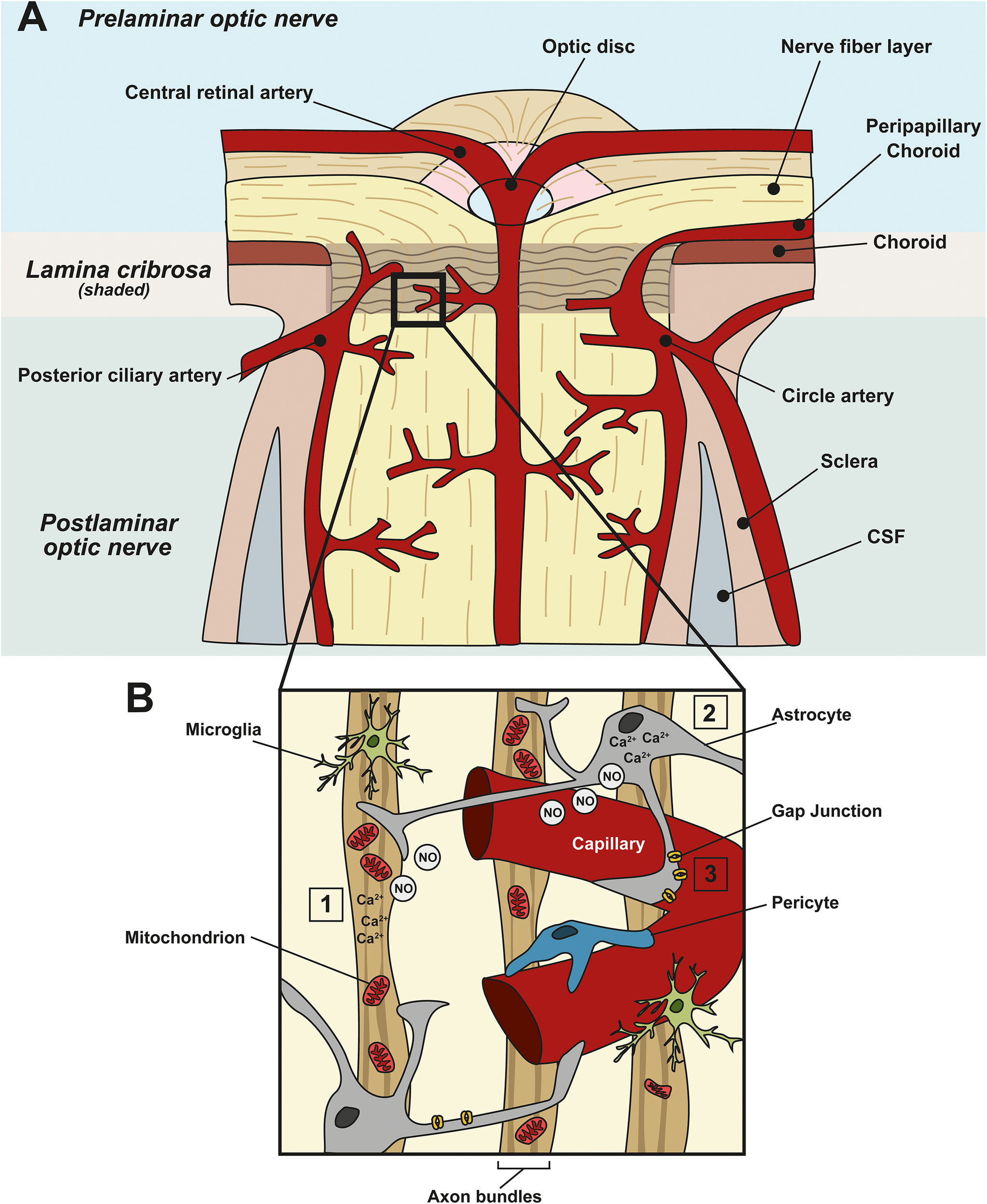 Neurovascular coupling in the ONH and vascular dysfunction in glaucoma. (A) Schematic showing the blood supply at the ONH. Prelaminar, lamina cribrosa, and postlaminar sections are indicated. The primary blood supply to the ONH and retina comes from the choroid, the central retinal artery, the posterior ciliary artery and the circle artery. (B) Enlargement of the boxed area in (A) showing a capillary and its associated cells in the ONH. Astrocytes, pericytes, and endothelial cells of blood vessels constitute the neurovascular unit (NVU), to link local neuronal activity to vascular changes. In healthy tissue, when there is a spike in neuronal activity (1), or metabolic demand, it leads to an increased intracellular concentration of Ca2+ in neurons and (2) astrocytes. This, in turn, leads to the generation of nitric oxide (NO), a vasoactive gaseous messenger, which can diffuse to nearby blood vessels, altering blood flow. In glaucoma, apoptotic neurons and reactive astrocytes lead to the breakdown of this coupling. (3) In addition, in glaucoma, ischemia, and perfusion instability damages astrocyte–astrocyte gap junctions, leading to miscommunication between astrocytes and neurons.