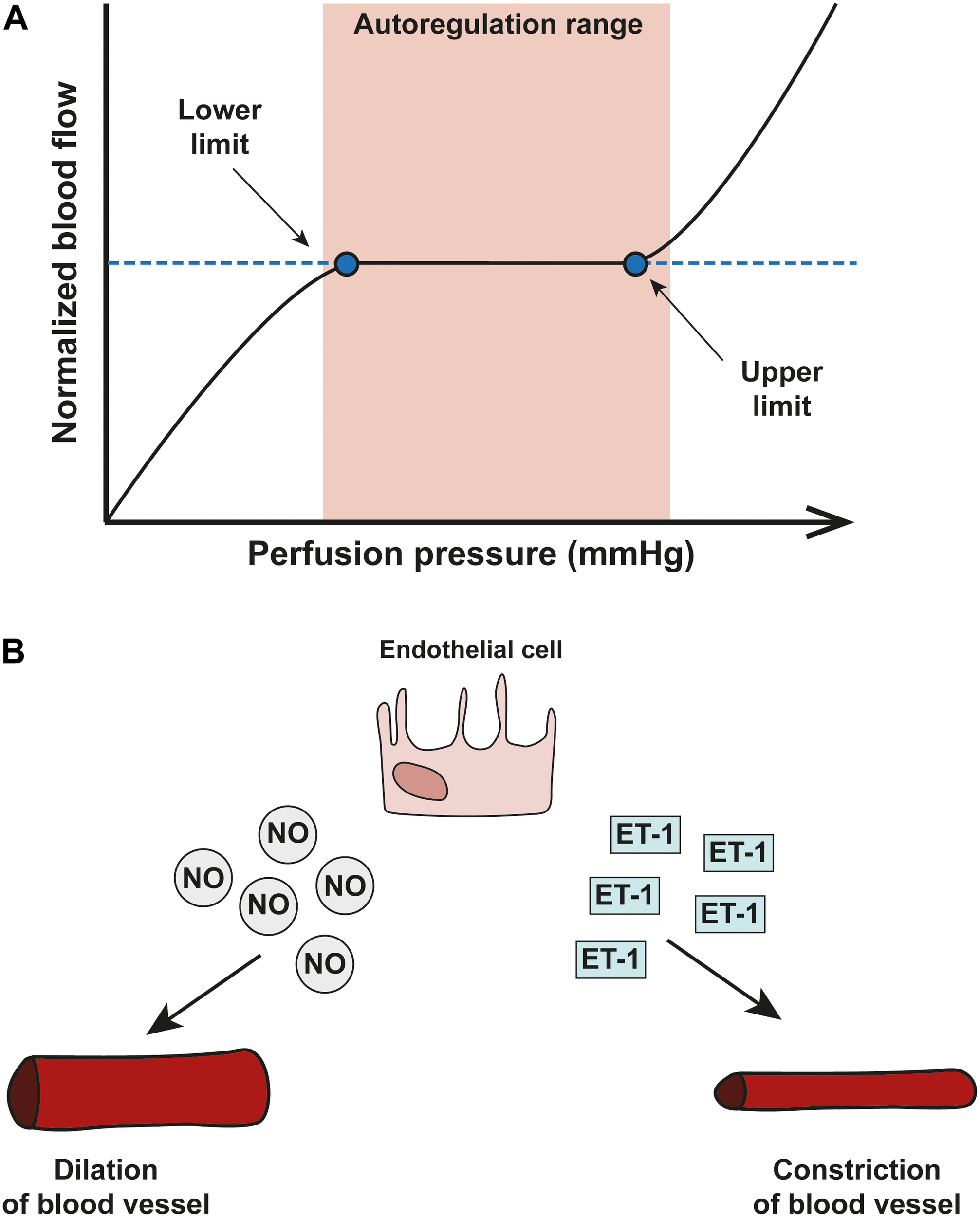 Blood flow autoregulation in the eye. (A) A schematic showing an autoregulation curve that describes the relationship between normalized blood flow (y-axis) and perfusion pressure (x-axis). Autoregulation can only operate within a critical range of OPP and once OPP surpasses the optimal range (shown in pink), autoregulatory systems start to break down. (B) The two important vasoactive substances released by endothelial cells are nitric oxide (NO) and endothelin-1 (ET-1) and autoregulation of the vascular system in the eye relies on a delicate balance between the two; NO is a potent vasodilator released by smooth muscle cells and endothelial cells which acts via pericytes to dilate capillaries. Opposite in function is ET-1, a potent vasoconstrictor.