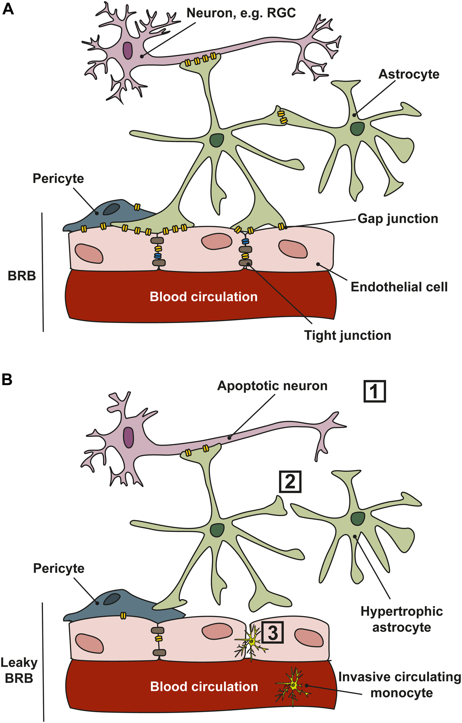 Cell communication in the NVU. (A) In healthy tissues, retinal ganglion cell (RGC) neurons, astrocytes and endothelial cells communicate through gap junctions which permit the movement of electrical conductance (Na+, K+, and Ca2+) and small molecules such as ATP/ADP, glutamate, and glucose, and second messengers. Gap junctions exist in the retina and ONH between neurons, glia and between vascular cells. (B) In glaucoma, several changes occur that affect communication between the cells of the NVU. (1) RGCs are vulnerable to stressors that lead to apoptosis; (2) cell–cell communication is lost as astrocytes and other glial cells become reactive and gap junction expression is reduced; (3) a reduction in gap junction expression, and loss of tight junctions between vascular cells leads to a leaky blood–retinal-barrier (BRB), allowing the infiltration of circulating monocytes into the retina and ONH.