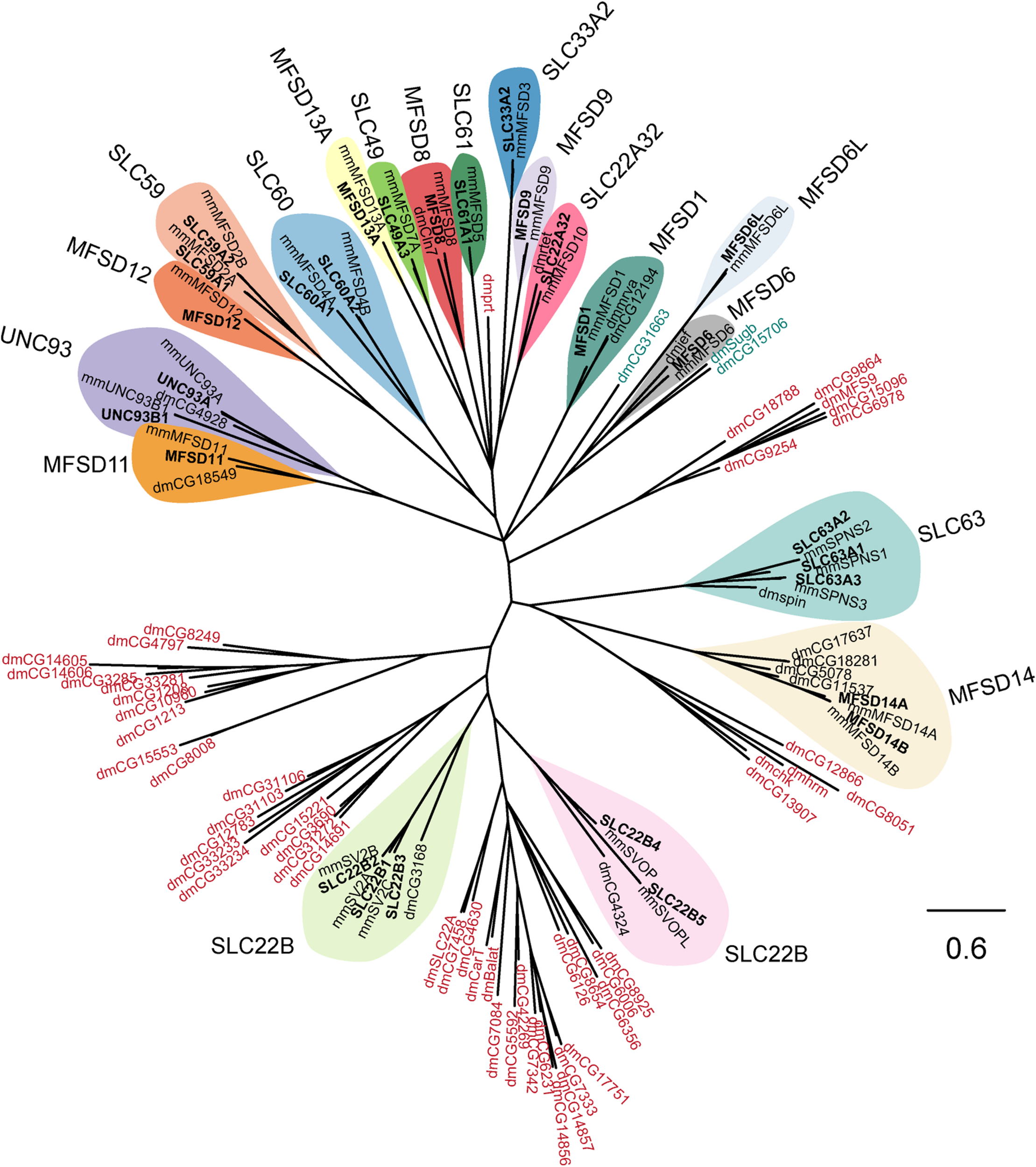 Several human putative SLCs are conserved in M. musculus and D. melanogaster. The phylogenetic relationship for putative SLCs in humans (bold text), mouse (mm), and fruit flies (dm) were investigated. The human and mouse protein sequences were downloaded from uniport.org (UniProt, 2019), according to earlier publications (de la Cruz et al., 2003). The human protein sequences were then used to build a Hidden Markov Model (HMM; Duprat et al., 2007; Eddy, 2011) that was used to search for relative proteins in the fruit fly proteome. The sequences were then combined in a multiple protein alignment using MAFFT (Katoh et al., 2019) and mrBayes (Huelsenbeck et al., 2001) was used to generate the tree, with a branch length of 0.6. All human putative SLCs had an orthologue in mouse, while orthologous proteins in fruit flies were only identified for SLC22A32 (rtet), SLC22B1–3 (CG3168), SLC22B4–5 (CG4324), SLC63A1–3 (spin), MFSD1 (mrva, CG12194), MFSD6 (jef), MFSD8 (Cln7), MFSD11 (CG18549), MFSD14A–B (CG5078, CG11537, CG17637, CG18281), and UNC93A–B1 (CG4928). The HMM also identified other proteins in fruit fly that resembles the conserved motif (MFS motif) for the putative SLCs, however, none of these proteins clustered clearly with a human putative SLC. Protein sequences in blue are proteins that clustered close with the MFSD6 and MFSD6L, while protein sequences in red are proteins belonging to other SLC families of MFS type.
