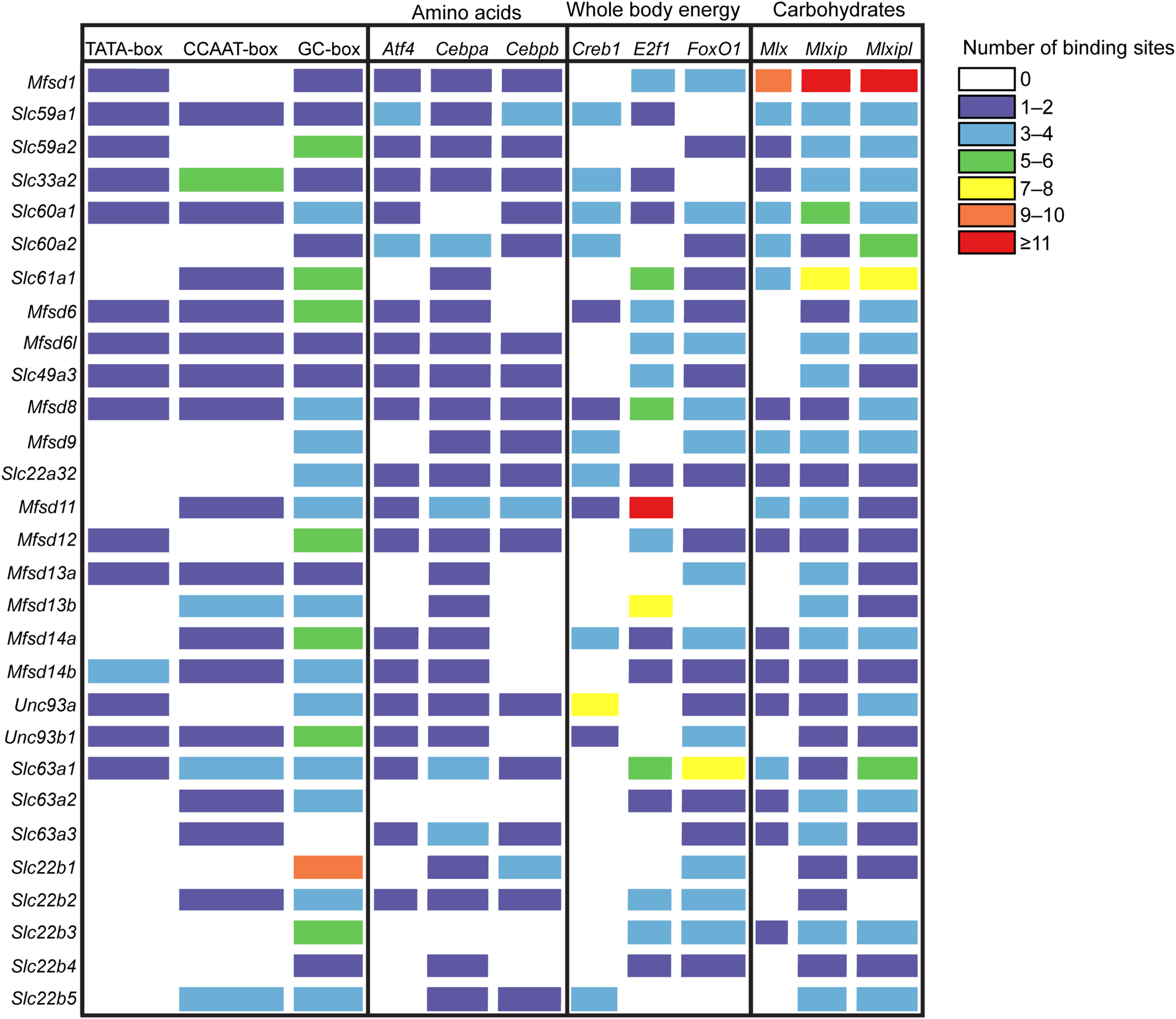Promoter analysis of the putative SLCs using protein sequences from mouse. The gene sequence, 1000 base-pair upstream to 100 base-pair downstream of the transcription start site, for each SLCs and putative transporter were investigated, and data was collected from the Eukaryotic Promoter Database (EPD) (Cavin Perier et al., 1998). The promoter Motifs library was used to search for promoter sequences, while the JASPER CORE 2018 vertebrate library was used to search for transcription factor motifs. The transcription factor (TF) motifs investigated were Atf4, Cebpa and Cebpb, common amino acid sensing elements, Creb1, E2f1 and FoxO1, TFs known to react to and regulate genes involved in energy expenditure, and Mlx, Mlxip and Mlxipl, carbohydrate sensing elements. The color indicates the number of binding sites present for each motif for each putative SLCs; purple 1–2, blue 3–4, green 5–6, yellow 7–8, orange 9–10, red ≥11.