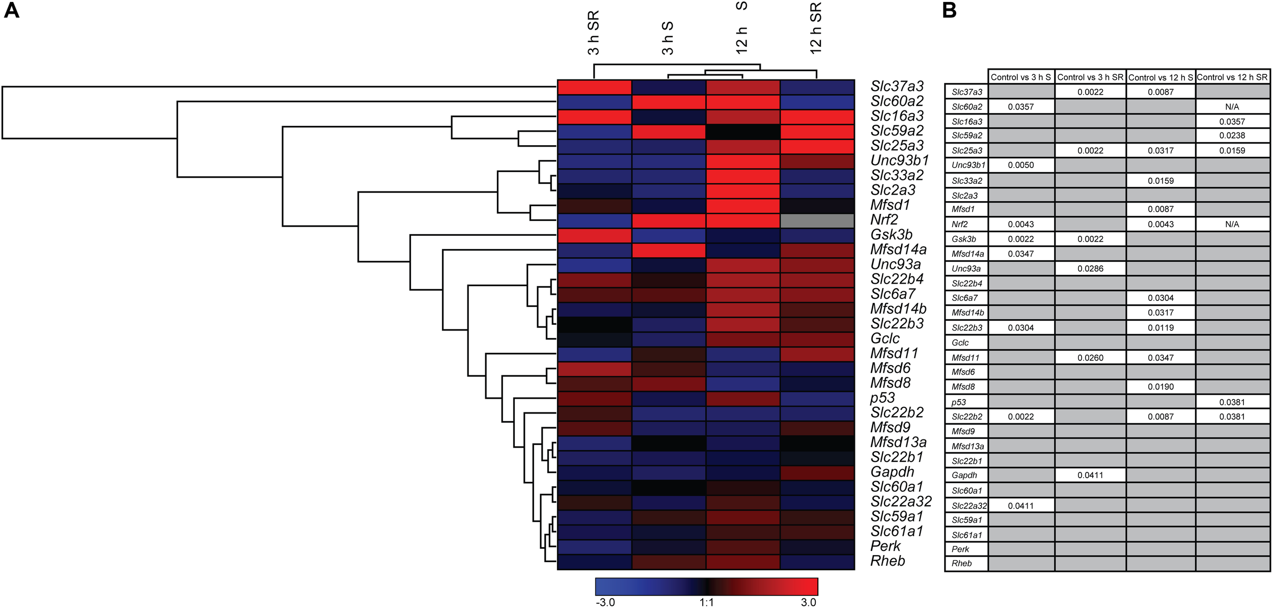 The mRNA expression regulation of putative SLCs and genes connected to glucose metabolism and stress after glucose starvation as well as glucose starvation and refeeding. Primary cortex cells from mice were either subjected to glucose starvation (S) or glucose starvation and refeeding (SR) for 3 and 12 h. The mRNA expression was measured using qRT-PCR (n = 5 or 6 per group) and the expression was normalized against five stable housekeeping genes. The control for each group was set to 1 and the mRNA expression for each group is relative to its control. GraphPad Prism version 5 was used to calculate differences in mRNA expression using Mann–Whitney (* > 0.05, ** > 0.01, *** > 0.001). The heatmap was generated using GENESIS version 1.7.6 using the differences in fold change between the experimental groups and controls; red = upregulation, blue = downregulation and gray = data missing. (A) The heatmap display the alteration in gene expression for 3 h S, 12 h S, 3 h SR and 12 h SR compared with its corresponding control in the primary cortex cells. The genes and experiments were hierarchical clustered. (B) The table summarize the p-values. For starved and refed samples of Slc60a2 and Nrf2, not enough replicates were successfully analyzed to perform statistics, indicated by “N/A” in the table.