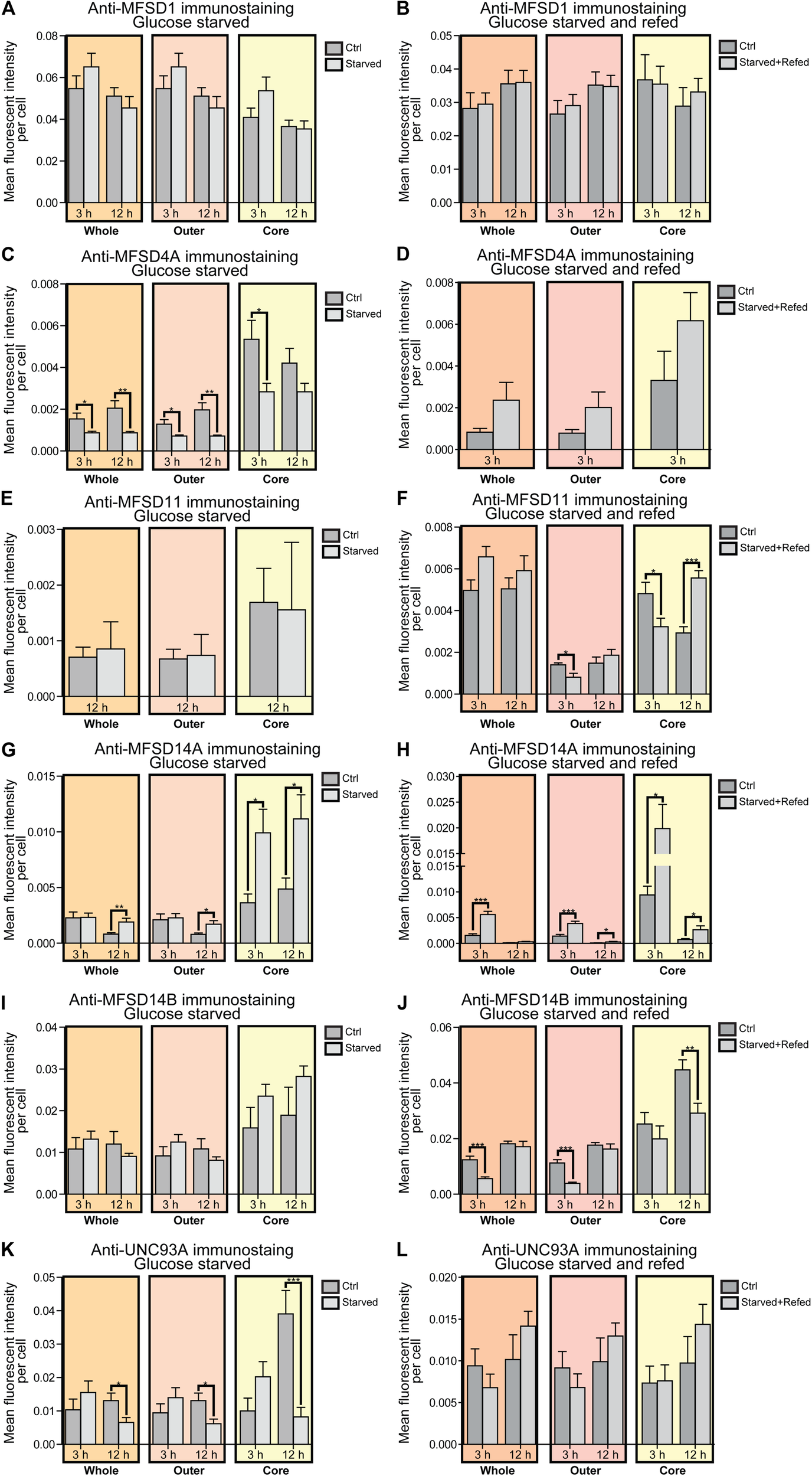 Changes in protein expression of putative SLCs subjected to glucose starvation and glucose starvation and refeeding. Primary cortex cultures subjected to glucose starvation (S) and glucose starvation and refeeding (SR) for 3 and 12 h were used for immunocytochemistry (ICC). In total, six putative SLCs were investigated where at least one antibody has been verified previously and shown to work on primary cortex cultures; MFSD1, MFSD4A, MFSD11, MFSD14A, MFSD14B and UNC93A. Images were taken using the same exposure settings for all pictures for each transporter. For each group, 6–10 pictures were taken including several cells. The images were processed in CellProfiler version 2.2.0th Identification of cellular compartments, nuclei (based on DAPI staining) and whole neuronal cytoplasm (based on Pan-neuronal staining) were performed. Mean and differences (±SEM), were calculated using unpaired t-test (* > 0.05, ** > 0.01, *** > 0.001). Each graph contain data regarding the mean fluorescent intensity for whole (orange), outer (apricot), and core (yellow) staining. No difference in expression was observed for MFSD1 after (A) glucose S nor (B) glucose SR. (C) MFSD4A was found to be downregulated in all three compartments after 3 and 12 h S, except for the core compartment after 12 h. (D) No alteration was found after 3 h SR, no data was collected for 12 h samples in the same experiment. No difference in immunostaining was observed for MFSD11 after (E) 12 h S, no data collected for 3 h S. (F) Reduction in immunostaining was observed in the outer and core compartment after 3 h SR, and increased immunostaining was found after 12 h SR. (G) The immunostaining of MFSD14A was induced in the core compartment after 3 h S, while induced in all three compartments after 12 h S. (H) Meanwhile after 3 h SR, MFSD14A staining was increased after 3 h in all three compartments, and still increased in the outer and core compartments after 12 h SR. (I) No differences were found for MFSD14B after glucose starvation, while (J) the immunostaining was reduced after 3 h SR in the whole and outer compartments, and after 12 h SR in the core. (K) UNC93A immunostaining was reduced after 12 h S in all three compartments, while (L) no differences were observed in cells subjected to 3 and 12 h SR.
