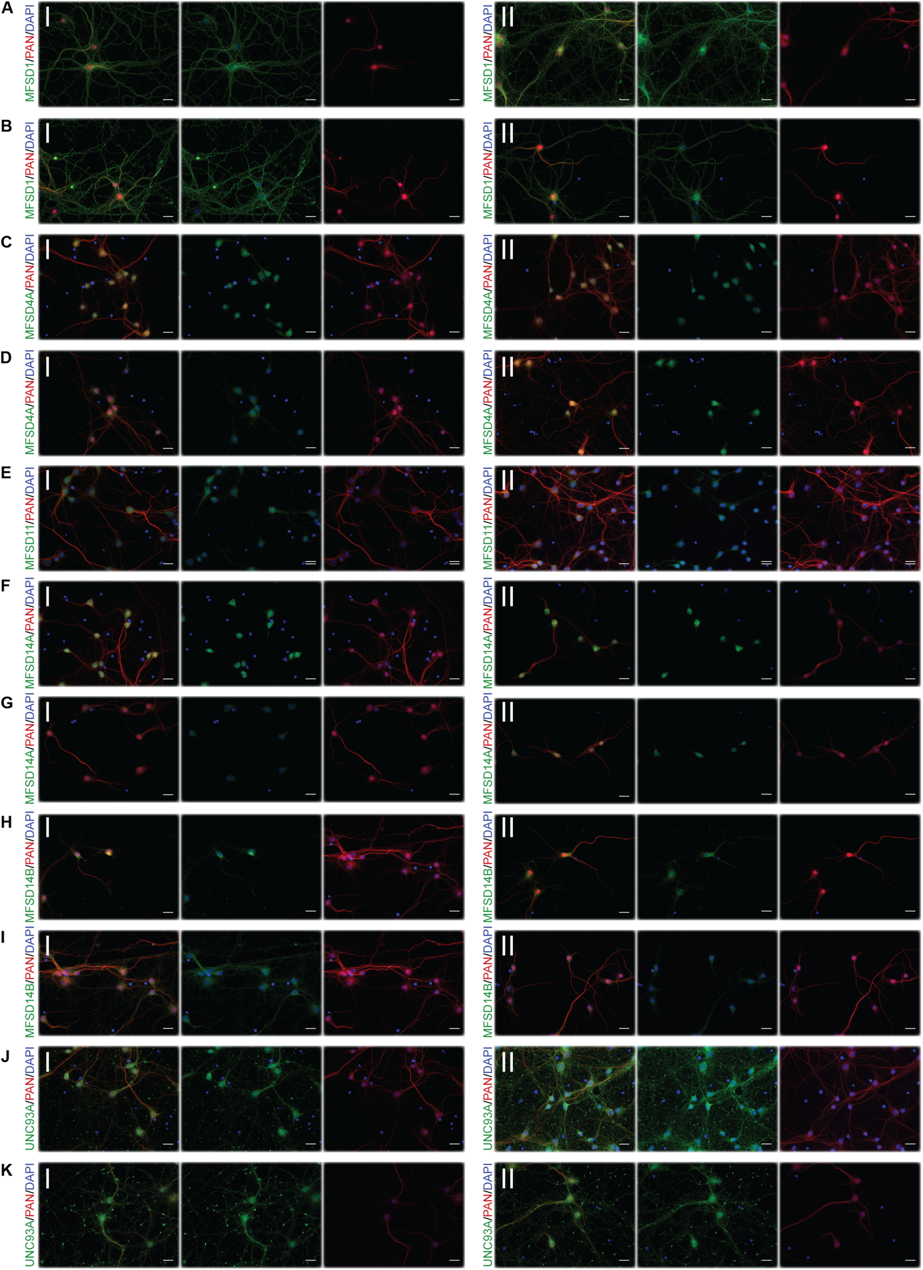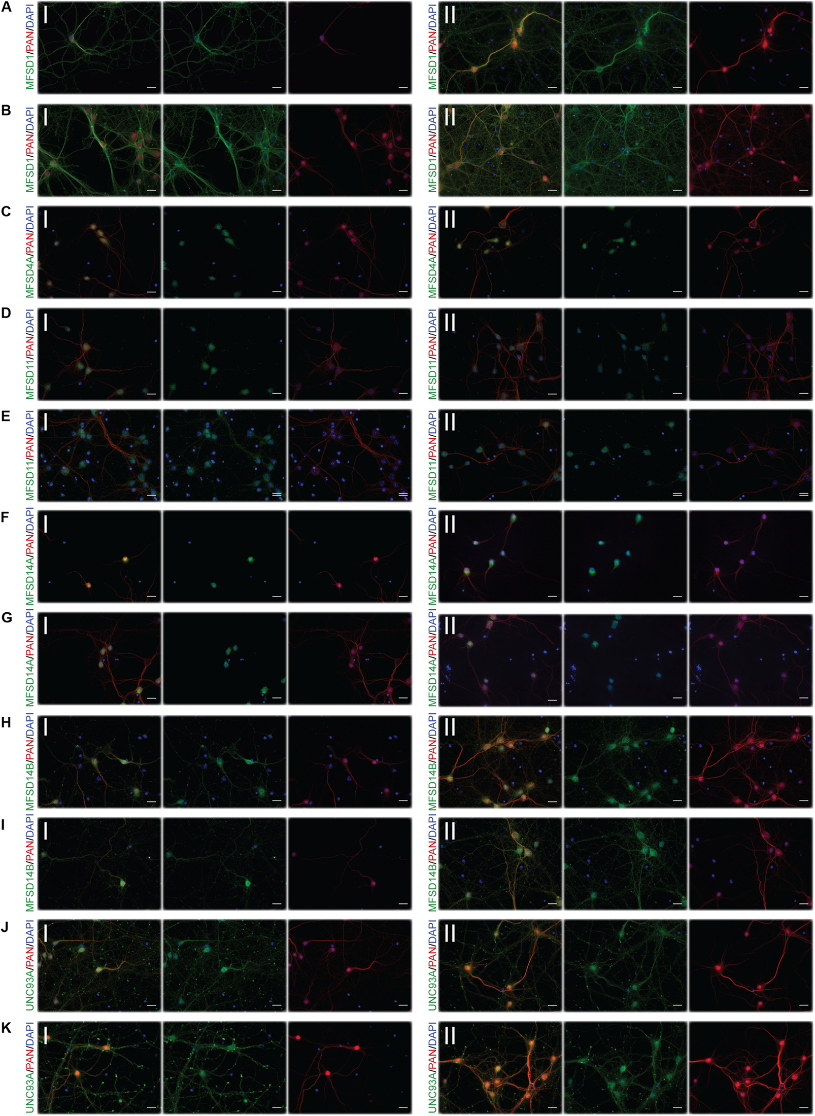 Representative ICC images of the putative SLCs subjected to glucose starvation and refeeding used for measuring alterations in protein expression. Primary cortex cultures subjected to glucose starvation and refeeding (SR) for 3 and 12 h were used for immunocytochemistry. Six putative SLCs were stained for: MFSD1, MFSD4A, MFSD11, MFSD14A, MFSD14B, and UNC93A. Images were taken using the same exposure settings for all pictures for each transporter, scale bar represents 20 μm. For each group, 6–10 pictures were taken including several cells. The putative SLC is labeled in green (FITC), the neuronal marker PAN in red (cyto) and the nucleus marker (DAPI) in blue. The panel consists of the representative ICC images of each target for both the (I) control and the (II) SR condition; (A) MFSD1 3 h, (B) MFSD1 12 h, (C) MFSD4A 3 h, (D) MFSD11 3 h, (E) MFSD11 12 h, (F) MFSD14A 3 h, (G) MFSD14A 12h, (H) MFSD14B 3h, (I) MFSD14B 12 h, (J) UNC93A 3 h, and (K) UNC93A 12 h.