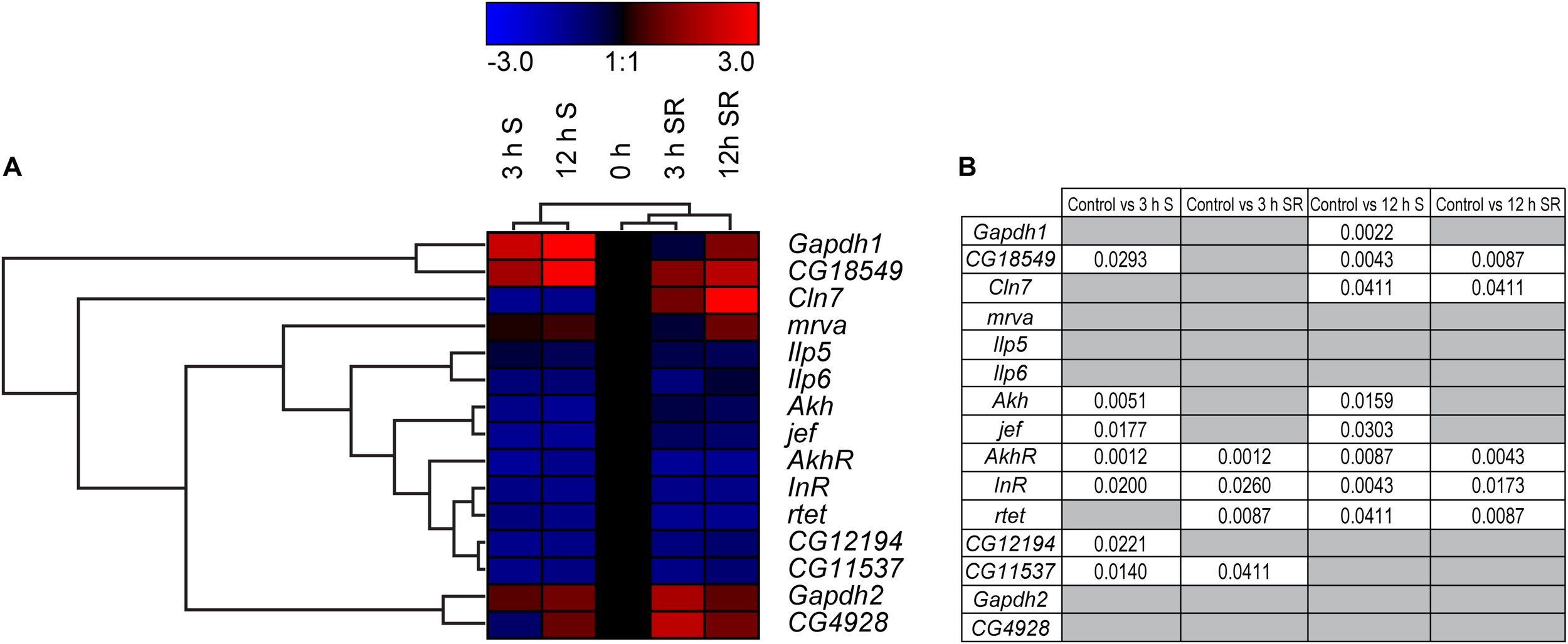 Gene regulation of putative SLCs and genes involved in metabolism in D. melanogaster. Four groups of adult male flies, aged 5 days, were subjected to starvation for 0 h (control), 3 and 12 h, two of the groups (n = 6–8, with 10 flies in each) were euthanized immediately after starvation, while two groups (n = 8, with 10 flies in each) were refeed with Jazz Mix Standard food for 12 h before euthanized. Samples were used to measure the mRNA expression via qRT-PCR and the expression was normalized against three stable housekeeping genes. The control was set to 1 and the mRNA expression for each group is relative to the control group (0 h of starvation). GraphPad Prism version 5 was used to calculate differences in mRNA expression using Kruskal–Wallis with Mann–Whitney as a post-hoc test with Bonferroni’s correction (*p < 0.0489, **p < 0.00995, ***p < 0.00099). The heatmap was generated using GENESIS version 1.7.6 using the differences in fold change between the experimental groups and the control; red = upregulation, blue = downregulation, black = no change. The genes and experiments were hierarchical clustered. (A) The heatmap display alterations in gene expression for 0 h S, 3 h S, 12 h S, 3 h SR and 12 h SR flies. (B) The table summarize the p-values.