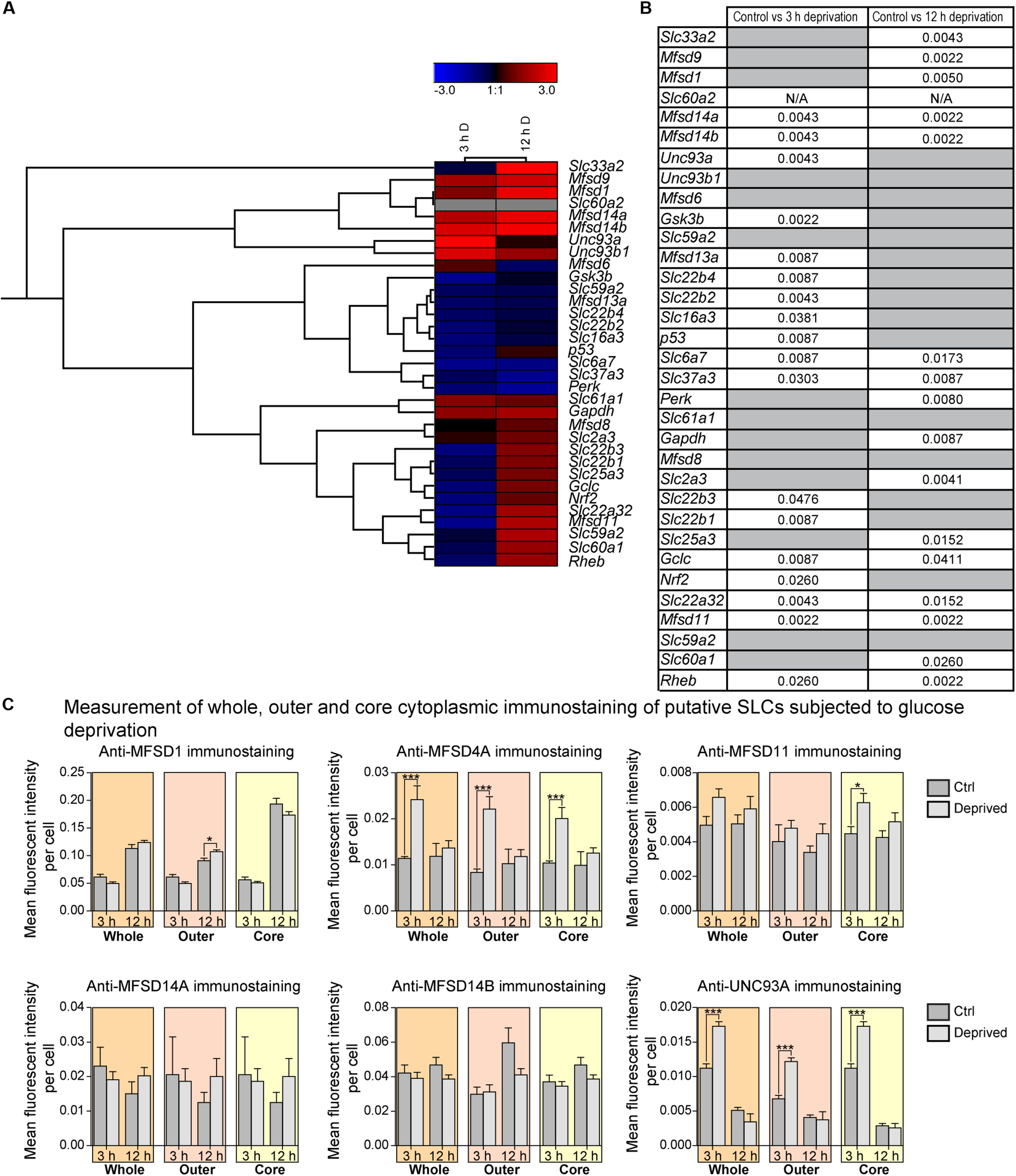 The mRNA and protein expression regulation of putative SLCs and genes connected to glucose metabolism and stress after glucose deprivation. Primary cortex cells from mice were subjected to glucose deprivation (D) for 3 and 12 h. The mRNA expression was measured using qRT-PCR (n = 6 per group) and the expression was normalized against five stable housekeeping genes. The control for each group was set to 1 and the mRNA expression for each group is relative to its control. GraphPad Prism version 5 was used to calculate differences in mRNA expression using Mann–Whitney (* > 0.05, ** > 0.01, *** > 0.001). The heatmap was generated using GENESIS version 1.7.6 using the differences in fold change between the experimental groups and controls; red = upregulation, blue = downregulation, black = no change and gray = data missing. The genes and experiments were hierachical clustered. (A) The heatmap display alterations in gene expression for 3 and 12 h glucose deprived cells compared with its corresponding control. (B) The table summarize the p-values. Primary cortex cultures subjected to glucose deprivation for 3 and 12 h were used for immunocytochemistry (ICC). Six putative SLCs were investigated; MFSD1, MFSD4A, MFSD11, MFSD14A, MFSD14B, and UNC93A. Images were taken using the same exposure settings for all pictures. For each group, 6–10 pictures were taken. The images were processed in CellProfiler version 2.2.0. Identification of cellular compartments, nuclei (based on DAPI staining) and whole neuronal cytoplasm (based on Pan-neuronal staining) were performed. The mean pixel intensity in protein staining was measured in each subcellular compartment and the average fluorescent intensity per cell was calculated. GraphPad Prism version5 was used to generate graphs, mean and differences (±SEM), were calculated using unpaired t-test (* > 0.05, ** > 0.01, *** > 0.001). Each graph contain data regarding the mean fluorescent intensity for whole (orange), outer (apricot), and core (yellow) staining. (C) No differences in immunostaining was observed for MFSD1, MFSD11, MFSD14A and MFSD14B, while the immunostainings for MFSD4A and UNC93A were induced in all three compartments after 3 h glucose deprivation.