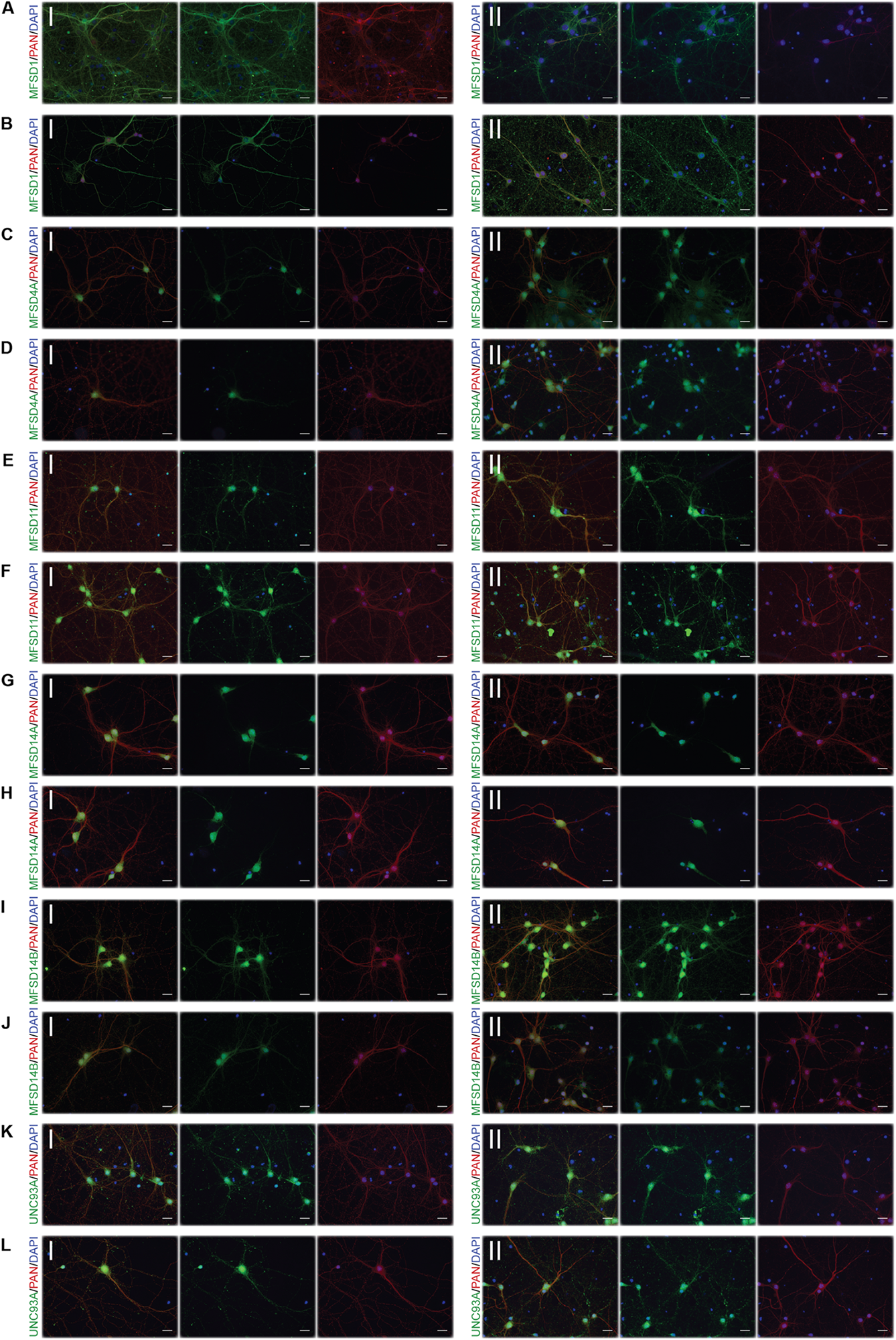 Representative ICC images of the putative SLCs subjected to glucose derpivation used for measuring changes in protein expression. Primary cortex cells from mice were subjected to glucose deprivation (D) for 3 and 12 h were used for immunocytochemistry. MFSD1, MFSD4A, MFSD11, MFSD14A, MFSD14B, and UNC93A were stained for. Images were taken using the same exposure settings for all pictures for each transporter, scale bar represents 20 μm. For each group, 6–10 pictures were taken including several cells. The putative SLC is labeled in green (FITC), the neuronal marker PAN in red (cyto) and the nucleus marker (DAPI) in blue. The panel consists of the representative ICC images of each target displaying both the (I) control and the (II) glucose deprivation; (A) MFSD1 3 h, (B) MFSD1 12 h, (C) MFSD4A 3 h, (D) MFSD4A 12 h, (E) MFSD11 3 h, (F) MFSD11 12 h, (G) MFSD14A 3 h, (H) MFSD14A 12h, (I) MFSD14B 3h, (J) MFSD14B 12 h, (K) UNC93A 3 h, and (L) UNC93A 12 h.