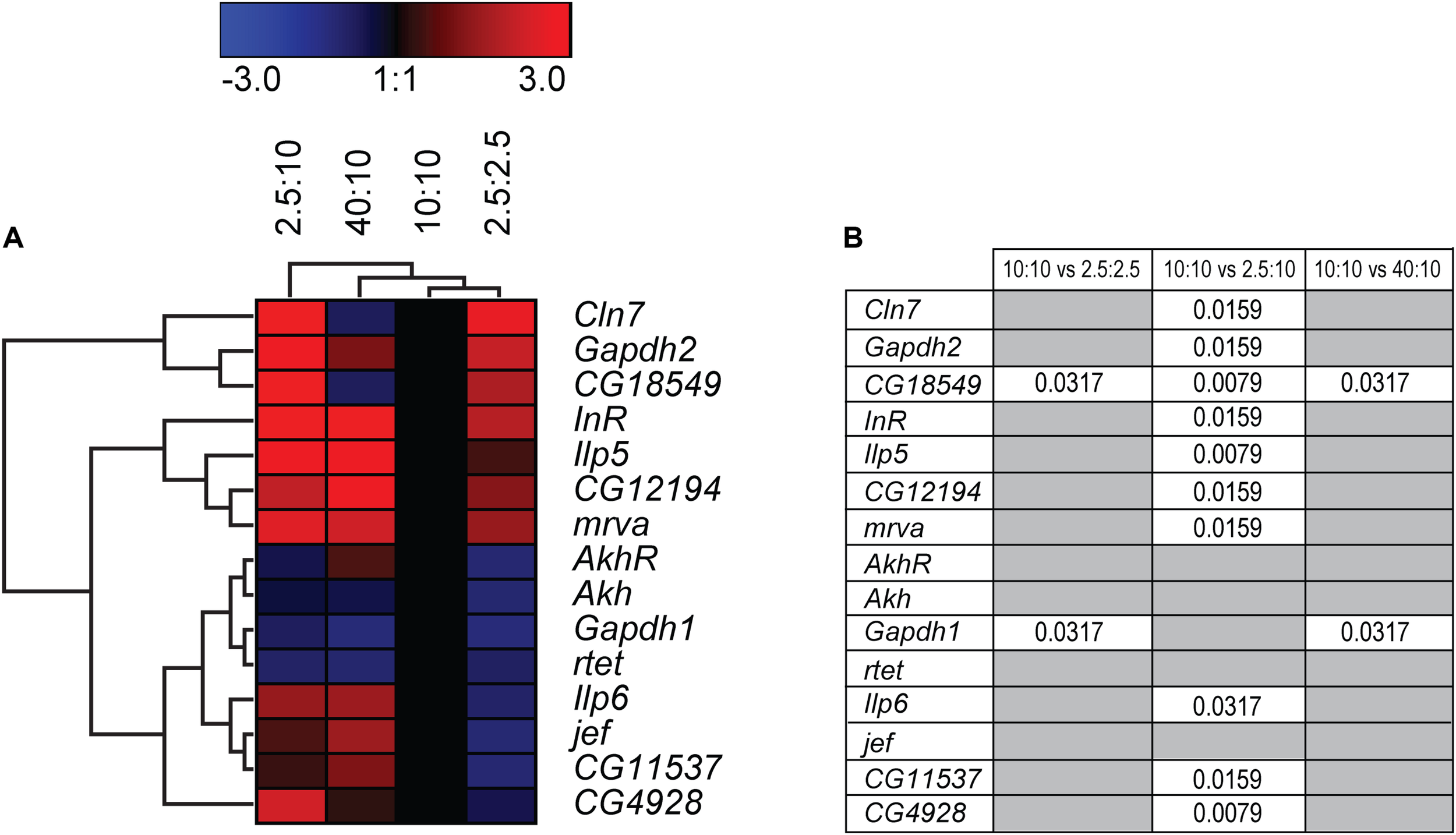 Gene regulation of putative SLCs and metabolic genes after feeding fruit flies different diets. Adult male flies (n = 6 with 10 flies in each), aged 5 days, were maintained for 5 days on low calorie (2.5 g:2.5 g sugar:yeast), low sugar (2.5 g:10 g sugar yeast), normal sugar (10 g:10 g sugar:yeast) (control), and high sugar (40 g:10 g sugar:yeast) diets. The mRNA expression was measured via qRT-PCR and the expression was normalized against three stable housekeeping genes. The control was set to 1 and the mRNA expression for each group is relative to the control group (10:10). GraphPad Prism version 5 was used to calculate differences in mRNA expression using Kruskal–Wallis with Mann–Whitney as a post-hoc test with Bonferroni’s correction (*p < 0.0489, **p < 0.00995, ***p < 0.00099). The heatmap was generated using GENESIS version 1.7.6 using the differences in fold change between the experimental groups and the control group; red = upregulation, blue = downregulation, black = no change. The genes and experiments were hierarchical clustered. (A) The heatmap display the alteration in gene expression for flies subjected to low calorie, low sugar, high sugar and control diet. (B) The table summarize the p-values.