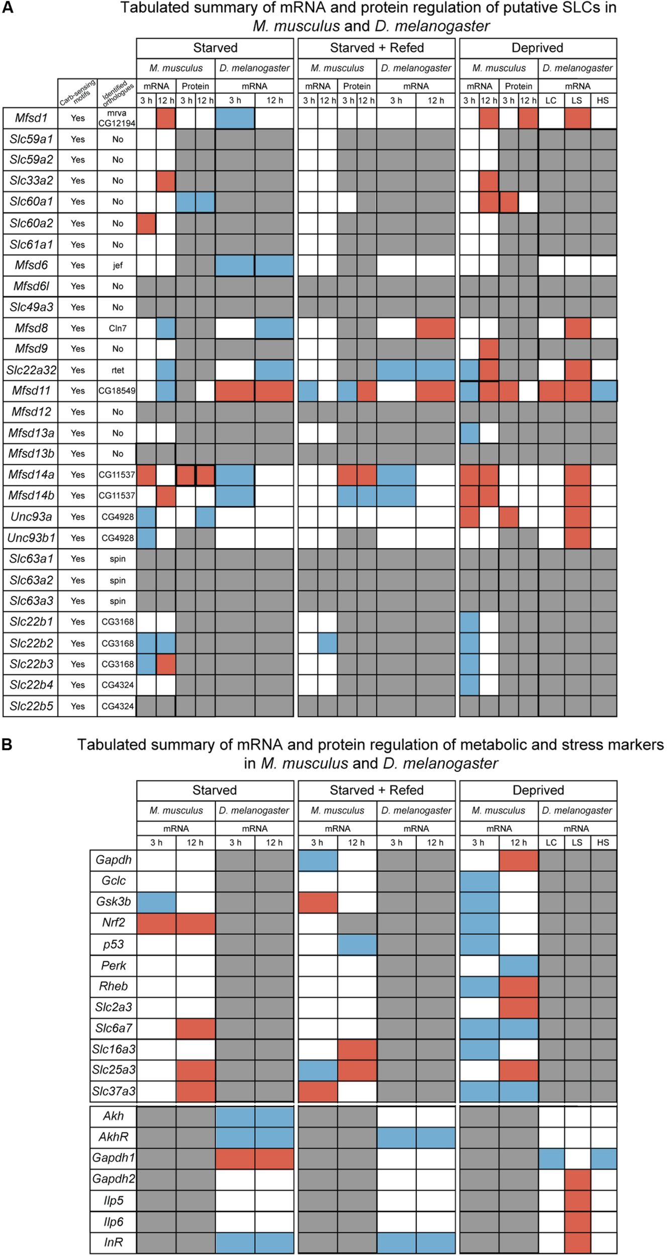 Summarizing of the results from in vitro and in vivo experiments. (A) Tabulated summary of results regarding the putative SLCs obtained from mouse primary cortex cultures and fruit fly; displaying the presence of carbohydrate sensing motifs (Yes/No), identified orthologues and their name, gene and protein regulation for the three diets performed in primary cultures (starved, starved+refed, and deprived), gene regulation for fruit flies subjected to different diets [starved, starved+refed, low calorie (LC), low sugar (LS) and high sugar (HS)]. Red box indicate upregulation, blue box indicate downregulation, white box illustrates no regulation observed and gray box display where information is not obtained. (B) Tabulated summary of metabolic and stress targets in primary cortex cells and fruit flies. Red box indicate upregulation, blue box indicate downregulation, white box illustrates no regulation observed and gray box display where information is not obtained.