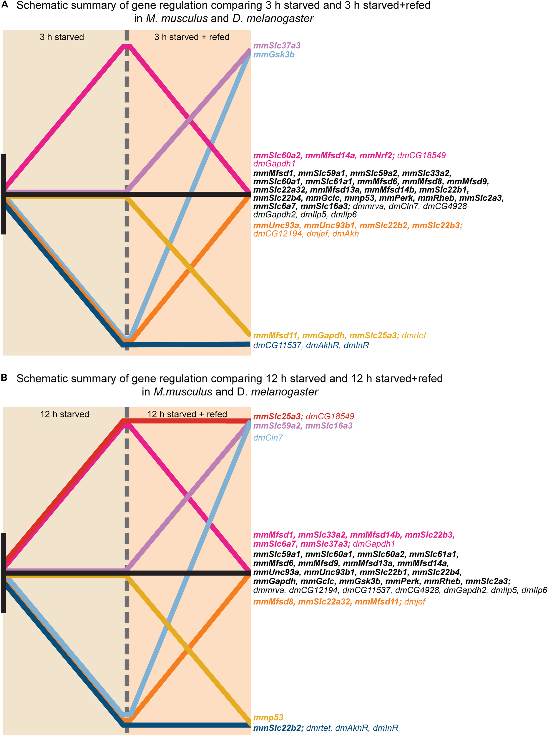 Graphical illustration of gene regulation in in vitro and in vivo. The gene regulation for each putative SLC and metabolic target measured in both primary cortex cultures and fruit flies were summarized in two graphical illustrations; one for each timepoint; no regulation (black), no regulation at 12 h S and upregulation at 12 h SR (purple), upregulation for both experimental groups (red), no regulation at 12 h S and downregulation at 12 h SR (yellow), downregulation at 12 h S and no regulation at 12 h SR (orange), downregulation at 12 h S and upregulation at 12 h SR (light blue), downregulation for both experimental groups (blue). (A) Display gene regulation after 3 h starved and starved+refed. (B) Display gene regulation after 12 h starved and starved+refed.