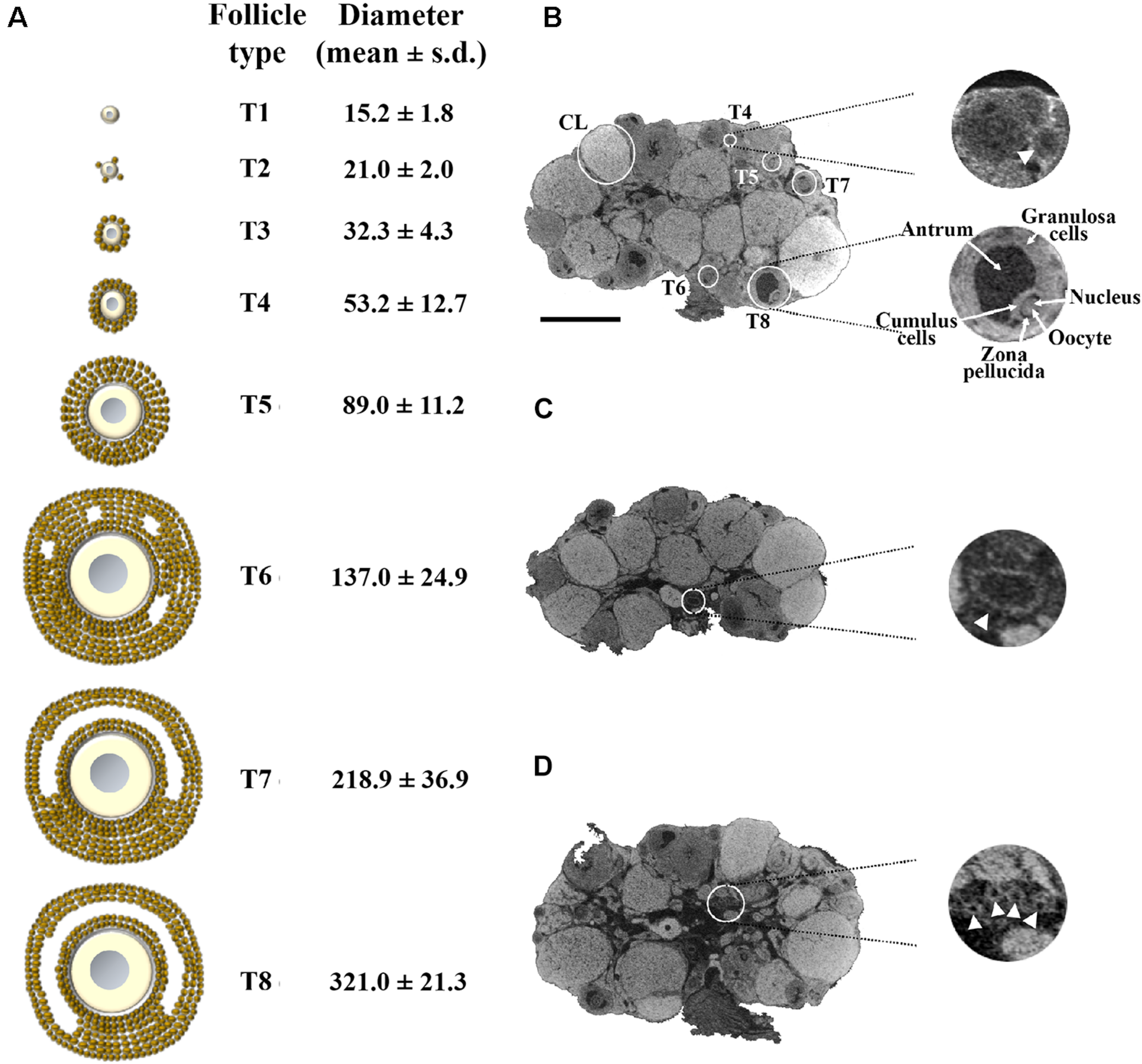 Representative 1.5 μm/pixel microCT image of the mouse ovary. (A) Schematic representation of the eight main stages of the mouse folliculogenesis, with their corresponding size in diameter (mean ± s.d.), during the pre-antral (T1–T5) and antral (T6–T8) growth phases. (B) A representative microCT section highlighting follicles from T4 to T8 and corpora lutea (CL). On the right-hand side (top), an enlargement of a secondary T4 follicle (arrow); on the right-hand side (bottom), an enlargement of a fully grown T8 follicle, in which the different cytological components (granulosa cells, antrum, cumulus cells, zona pellucida space, oocyte with its nucleus) are clearly visible. (C) microCT section with an enlargement of a vessel (arrowhead; 150 μm in diameter) at the ovarian hilum site. (D) microCT section with an enlargement of a group of small vessels (arrowheads; 35 μm in diameter) in the medulla region. Bar, 500 μm.