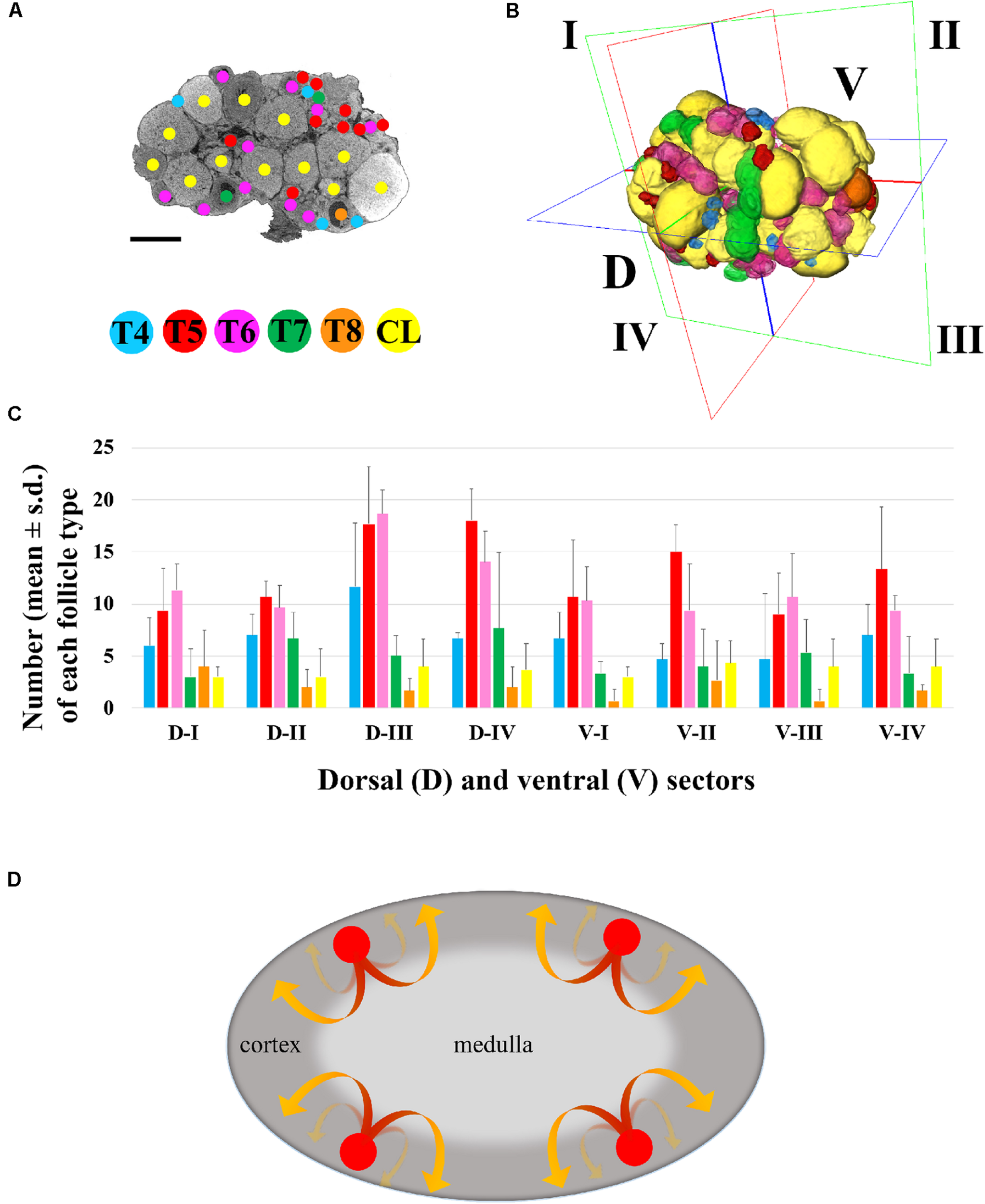 Then, we proceeded by segmenting both the dorsal (D-I to D-IV) and ventral (V-I to V-IV) region into four, equally partitioned, sectors. Sectors contained an equal total number of follicles (41.7 ± 12.6; p > 0.05) and an identical number of each follicle type, with the exception of T5 and T6, which resulted the most numerous (p < 0.05), and of fully grown T8, the smallest group (Supplementary Table S1 and Figure 3C).