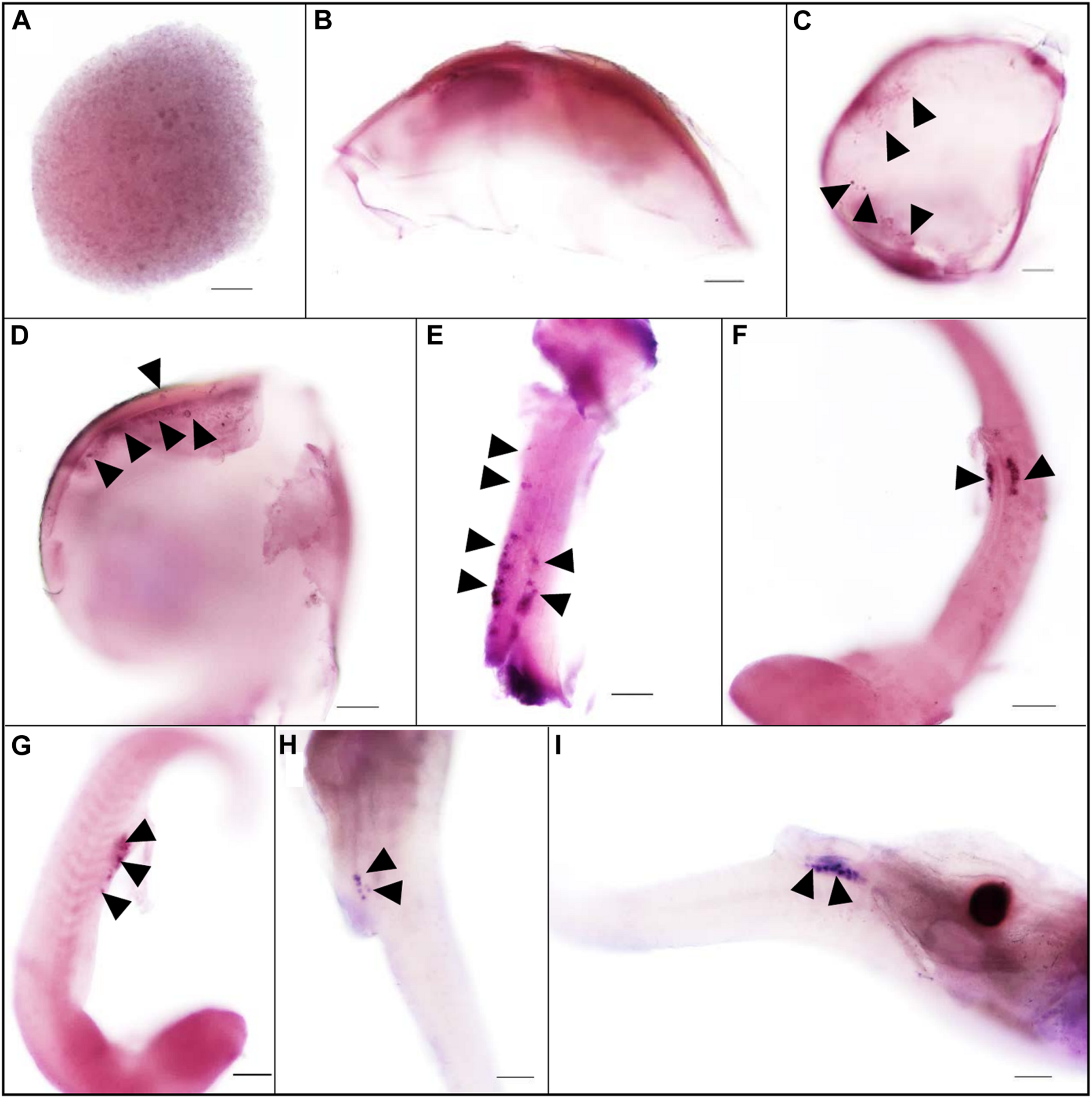 Figure 2. The expression pattern of Ssvas during embryogenesis was analyzed with WISH. All blastomeres were strongly stained at the blastula stage (A). The signal in the cell became non-uniform at the 30%-epiboly stage (B). Ssvas-positive cells appeared at the 70% epiboly stage (C). PGCs randomly aligned along the anterior of the body axes at the 90% epiboly stage–early neurula stage (D) and lined along the anterior–posterior axis on both sides of the embryonic body at the somite stage (E). PGCs formed two clusters and aligned bilaterally on the ventral side at heart beating stage (F,G) and localized at the dorsal sides of the gut, ventral side of notochord at hatching Sage (H,I). Black arrowheads indicated Ssvas-positive cells (PGCs) (stained with dark purple or blue). Scale bar, 100 μm.