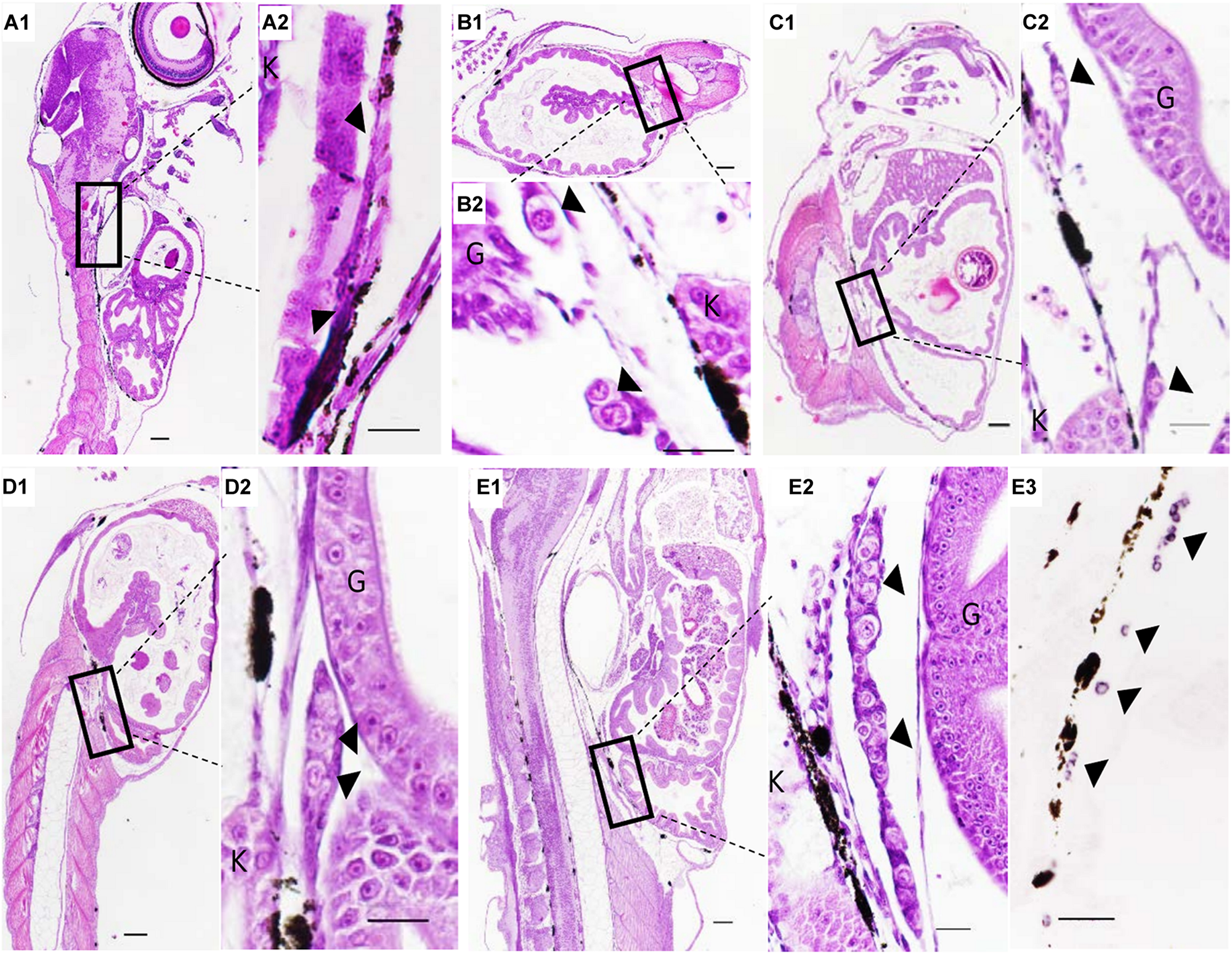 Figure 3. The PGCs migration after birth of Sebastes schlegelii. (A1–E2) were tissue sections with H&E stain. (E3) was SISH corresponding to (E2). PGCs were located in the upper part of the body cavity under the notochord at 2 dab, sagittal sections (A1,A2) and covered by a single-layer somatic cell at 8 dab, coronal sections (B1,B2). PGCs migrated to the genital ridge at 9 dab, sagittal sections (C1,C2) and formed elongated gonadal primordia at 10 dab, sagittal sections (D1,D2). Distinct primordial gonads were discovered in the posterior part of the body cavity (E1,E2), and the PGCs were strongly stained with the Ssvas antisense probe by SISH at 15 dab, sagittal sections (E3). Black arrowheads indicated PGCs; G and K indicated gut and kidney, respectively. Scale bar, 100 μm (A1,B1,C1,D1,E1); 50 μm (A2,B2,C2,D2,E2,E3).
